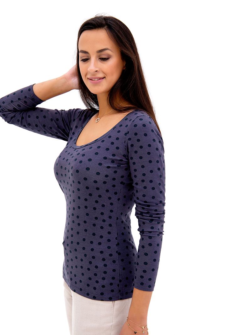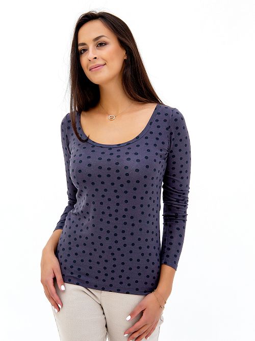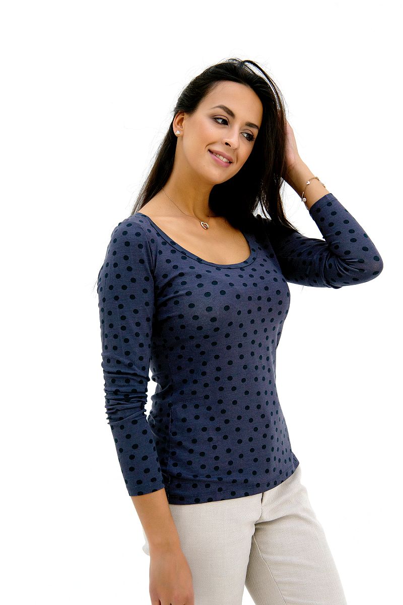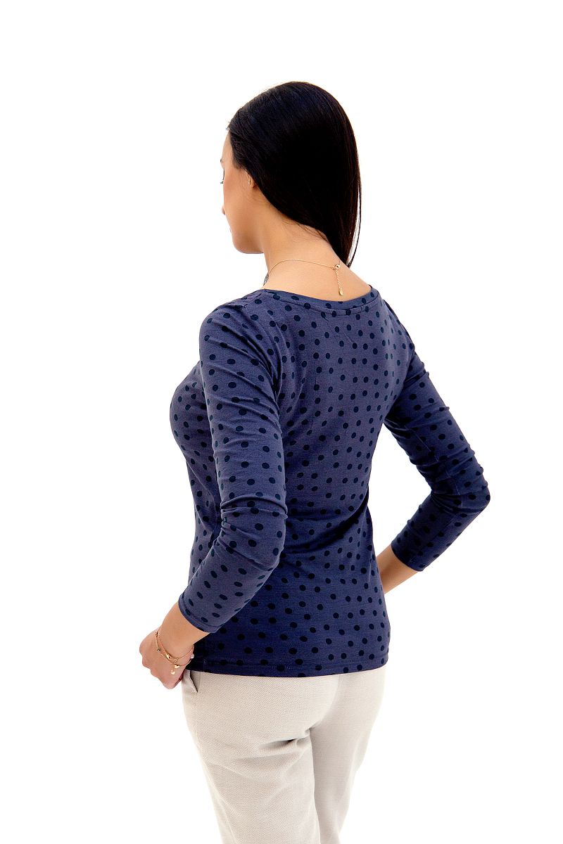 Лонгслив из трикотажного полотна, выполнен в спокойной цветовой гамме. Модель оформлена принтом "в горошек" по всей длине изделия. Рукав 3/4. Горловина округлая. Простой крой, изящный силуэт - делают модель незаменимой в повседневном гардеробе. Состав: 100 % вискоза. Длина изделия 67 см. Рост модели на фото 173 см.