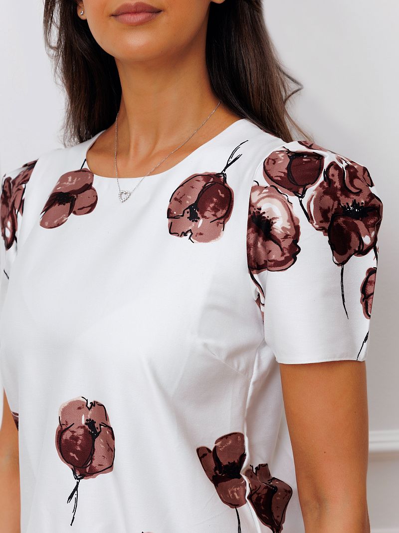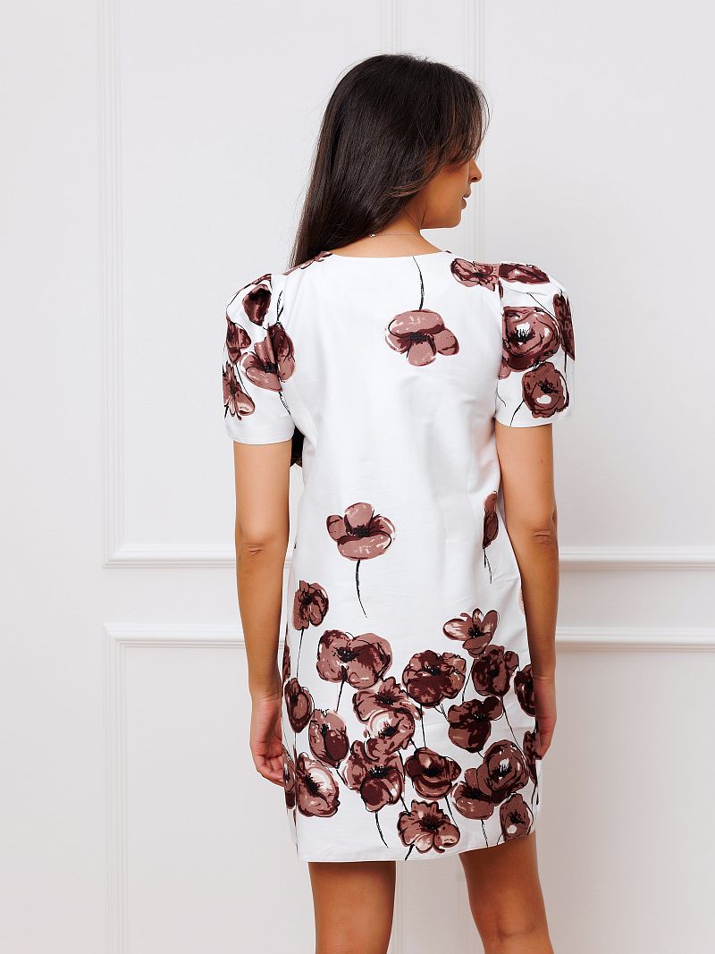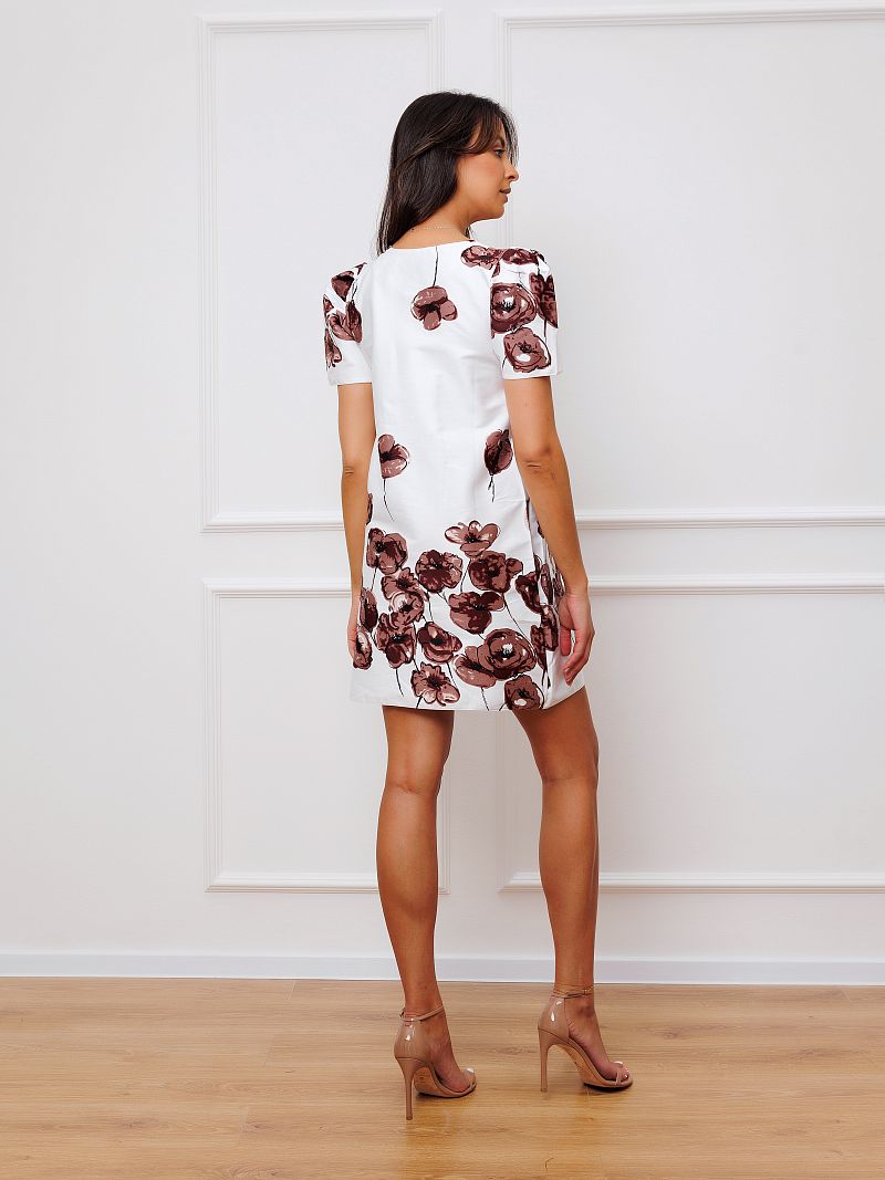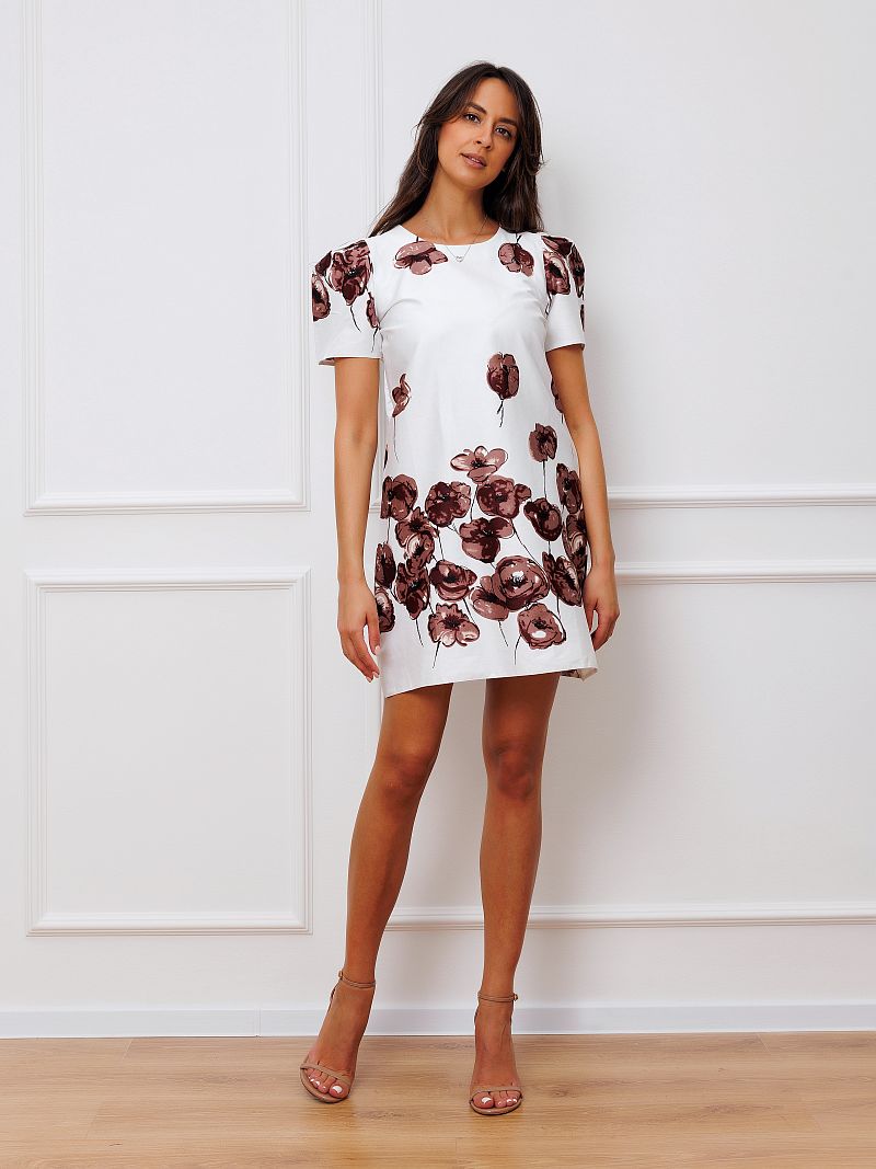 Нежное платье-мини прямого кроя. Модель украшена контрастным цветочным принтом. Такая модель замечательно подойдет для создания женственного образа на каждый день. Рукав короткий. Горловина округлая. Состав: 95% полиэстер, 5% эластан. Длина изделия 82 см. Рост модели на фото 173 см (+ каблук).