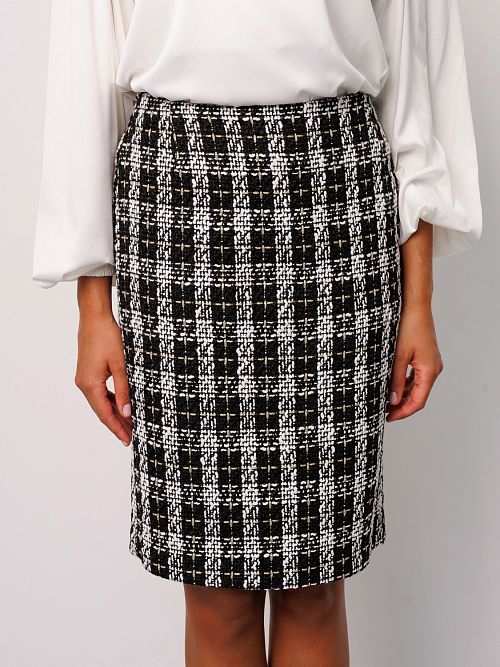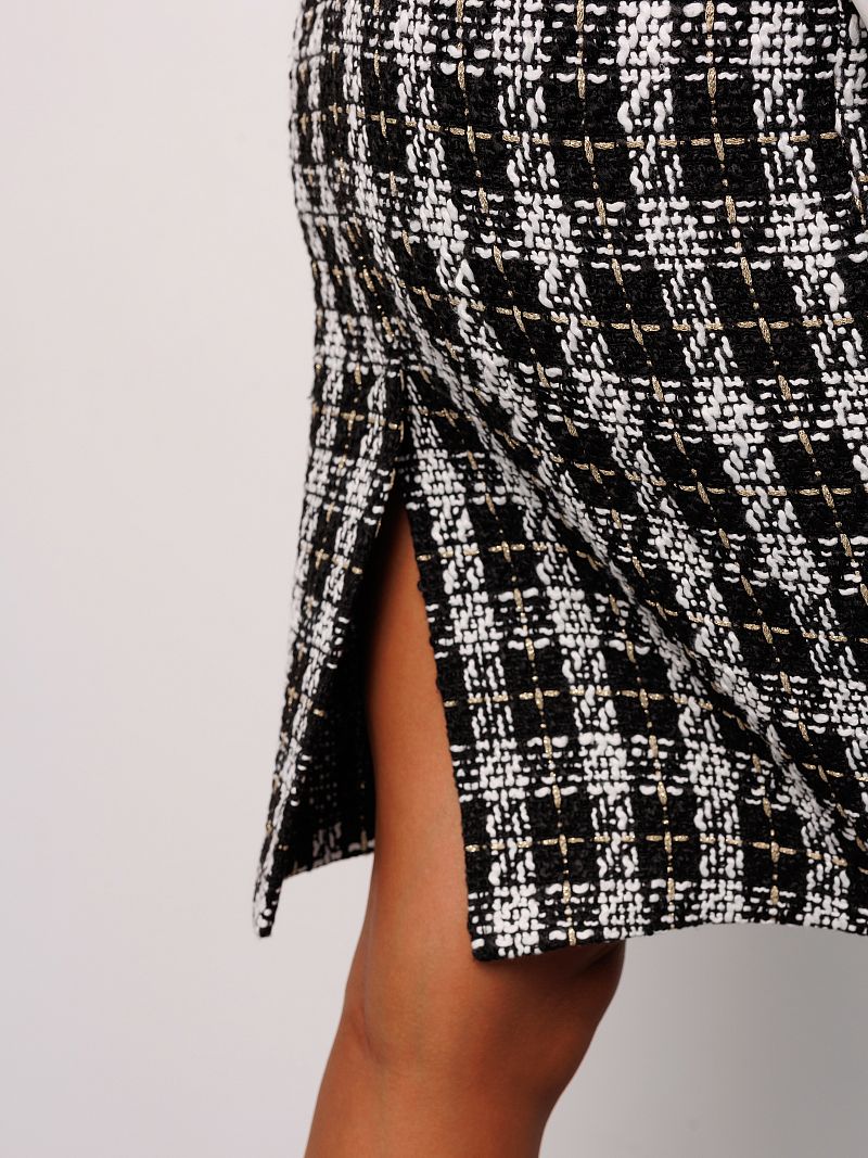 Юбка гусиная лапка придает Вашему образу изюминку, экспрессию и неповторимость. Ее фигурный крой гармонично подчеркнет красоту и женственность вашего силуэта, а средняя посадка и пояс юбки на резинке, что делает посадку идеальной на любой фигуре. Высокое качество материала обеспечит надежную защиту от холода и создаст непревзойденный уровень комфорта в холодные дни. Эта утепленная зимняя юбка карандаш с разрезом сочетает в себе функциональность и стиль, делая ее идеальной для повседневных casual образов и образов олд мани, выделяющих вас среди окружающих. Яркий клетчатый рисунок придает ей неповторимый шарм, а средняя посадка подчеркивает ее универсальность. Это базовый элемент вашего гардероба, который позволит вам легко сочетать ее с любой одеждой и создавать разнообразные стильные образы. Твидовая юбка станет незаменимым помощником для вашего делового гардероба в офис или в школу, добавляя ему изысканности и элегантности. Модель декорирована золотой нитью с люрексом, это придает изделию роскошный вид.