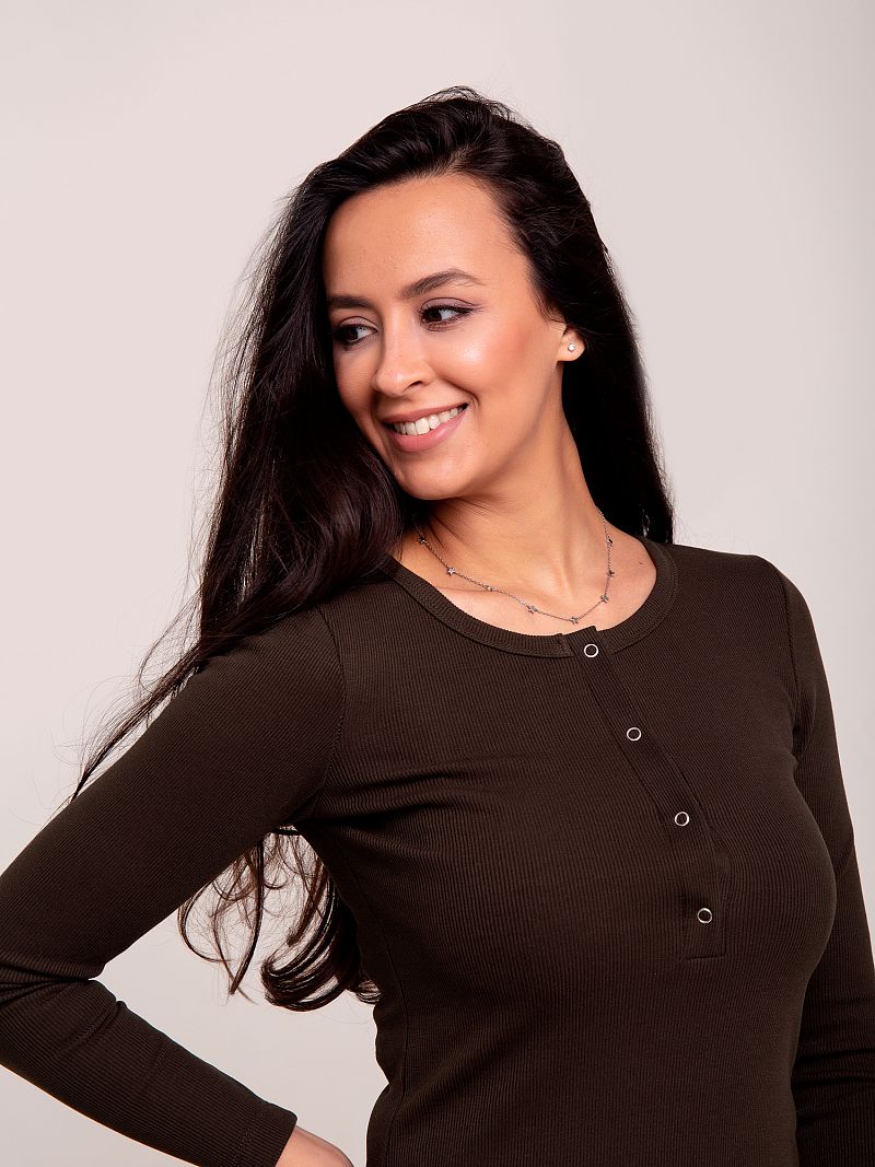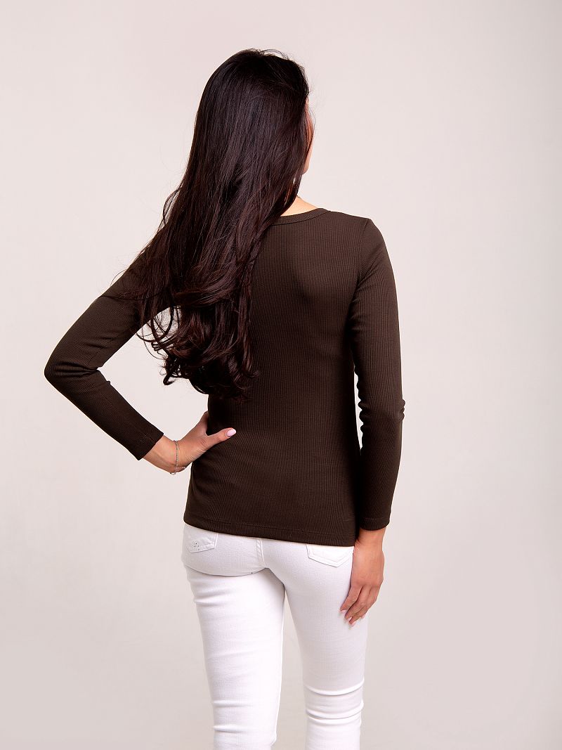 Трикотажный лонгслив лаконичного дизайна, выполнен в спокойном глубоком оттенке. Модель на груди дополнена планкой с фурнитурой. Вырез горловины округлый. Рукав длинный. Материал - трикотаж, характеризующийся мягкостью и эластичностью. Ввиду своей универсальности, лонгслив удачно комбинируется как с яркой юбкой-миди, так и с повседневными джинсами-скинни. Состав: 95% хлопок, 5% лайкра. Длина изделия см. Рост модели на фото 173 см.
