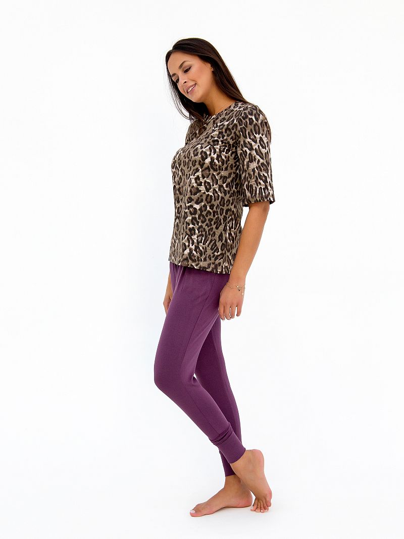 Трикотажный костюм в контрастных цветах, который состоит из блузы и брюк. Блуза выполнена в популярном анималистическом принте "леопард" по всей длине изделия, что добавляет выразительности образу. Рукав до локтя. Горловина округлая. Брюки однотонного контрастного цвета, дополнены боковыми карманами и манжетами. Ткань - трикотаж, который характеризуется мягкостью и эластичностью. Состав: блуза - 95% хлопок, 5% эластан, брюки - 100% вискоза. Длина блузы 64 см, длина брюк 90 см. Рост модели на фото 173 см.