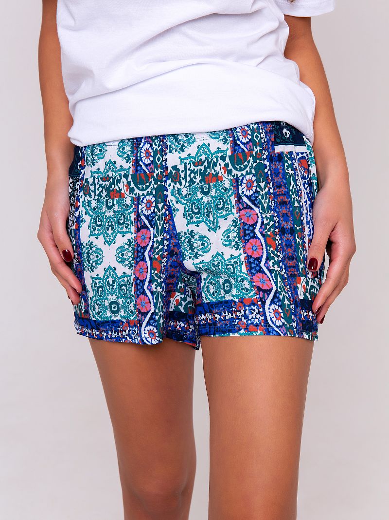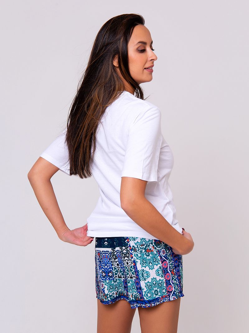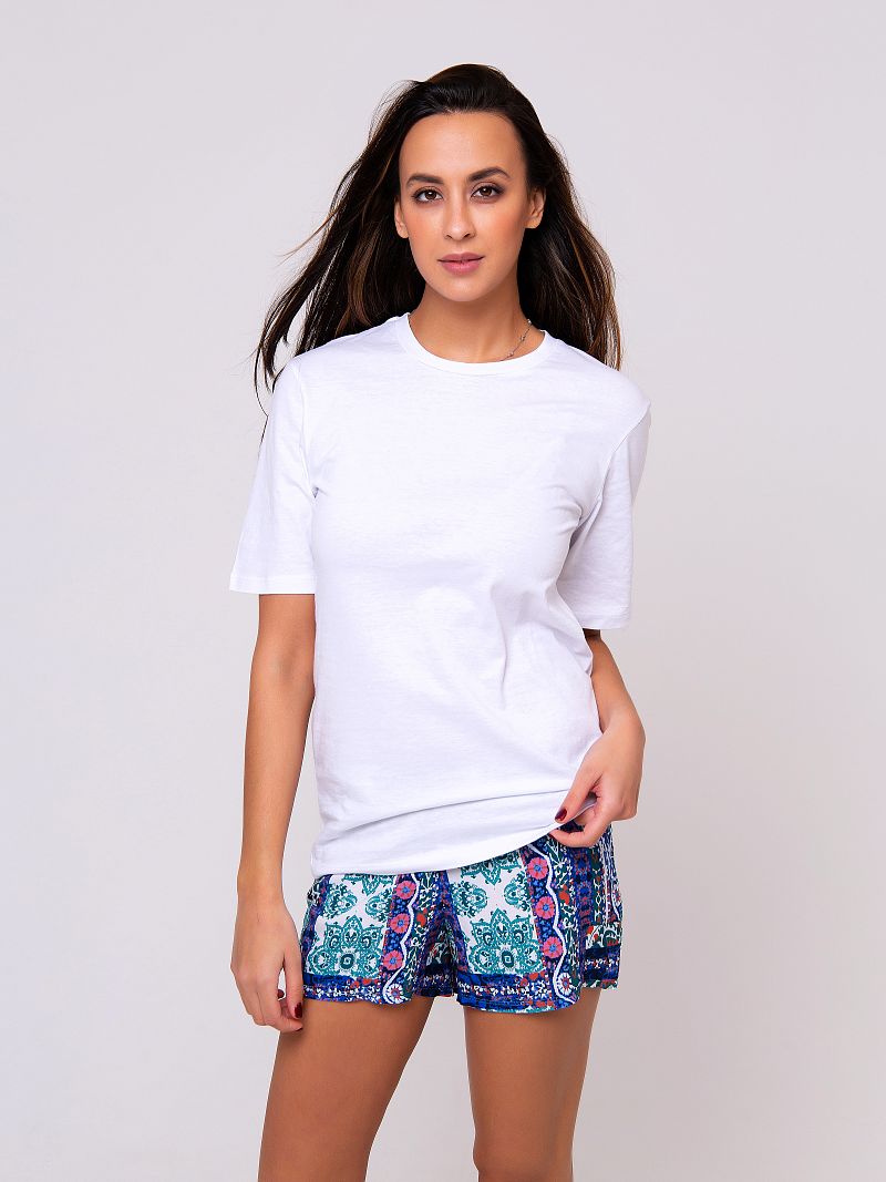 Трикотажный костюм, состоящий из шорт и футболки. Футболка базового цвета лаконичного дизайна. Рукав короткий. Вырез горловины округлый. Изюминку изделию добавляют контрастные шорты, оформленные оригинальным принтом. Материал - приятнейшее к телу триктажное полотно. Состав: 100% хлопок. Рост модели на фото 173 см.