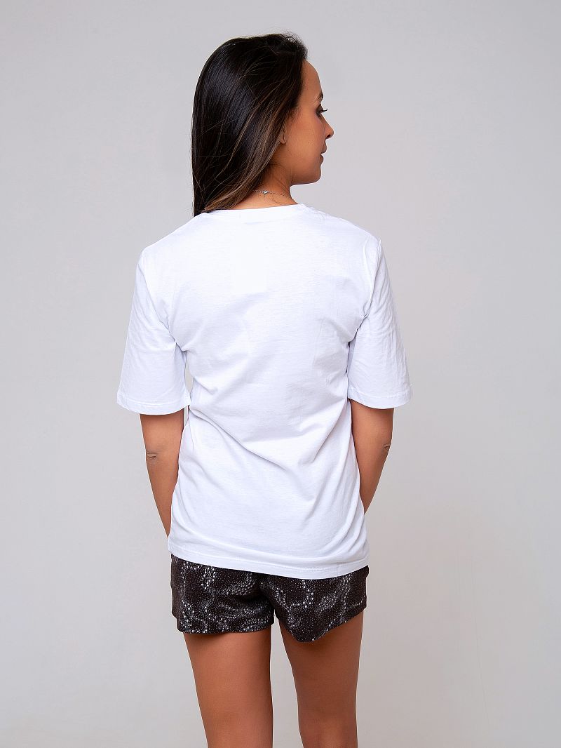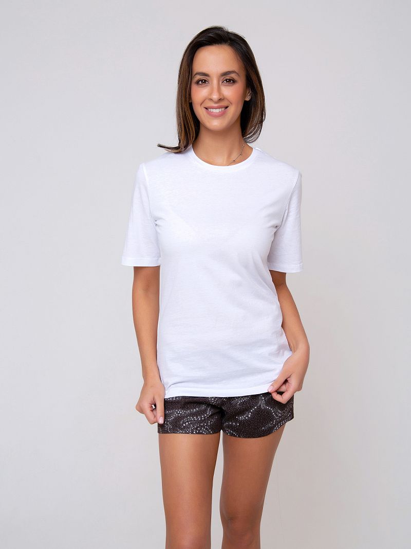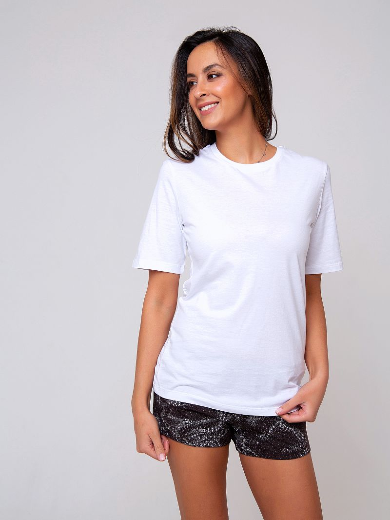 Трикотажный костюм, состоящий из шорт и футболки. Футболка базового цвета лаконичного дизайна. Рукав короткий. Вырез горловины округлый. Изюминку изделию добавляют контрастные шорты, оформленные оригинальным принтом. Материал - приятнейшее к телу триктажное полотно. Состав: футболка 100% хлопок, шорты 60% х/б + 40% п/э. Рост модели на фото 173 см.