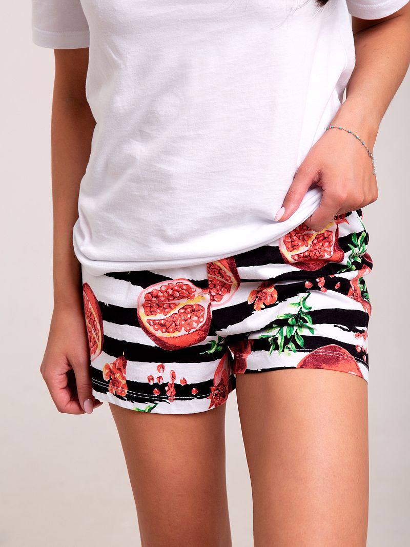 Трикотажный костюм, состоящий из шорт и футболки. Футболка базового цвета лаконичного дизайна. Рукав короткий. Вырез горловины округлый. Изюминку изделию добавляют контрастные шорты, оформленные не только "в полоску", но и сочным ярким принтом. Материал - приятнейшее к телу триктажное полотно. Состав: 100% хлопок. Длина изделия см. Рост модели на фото 173 см.