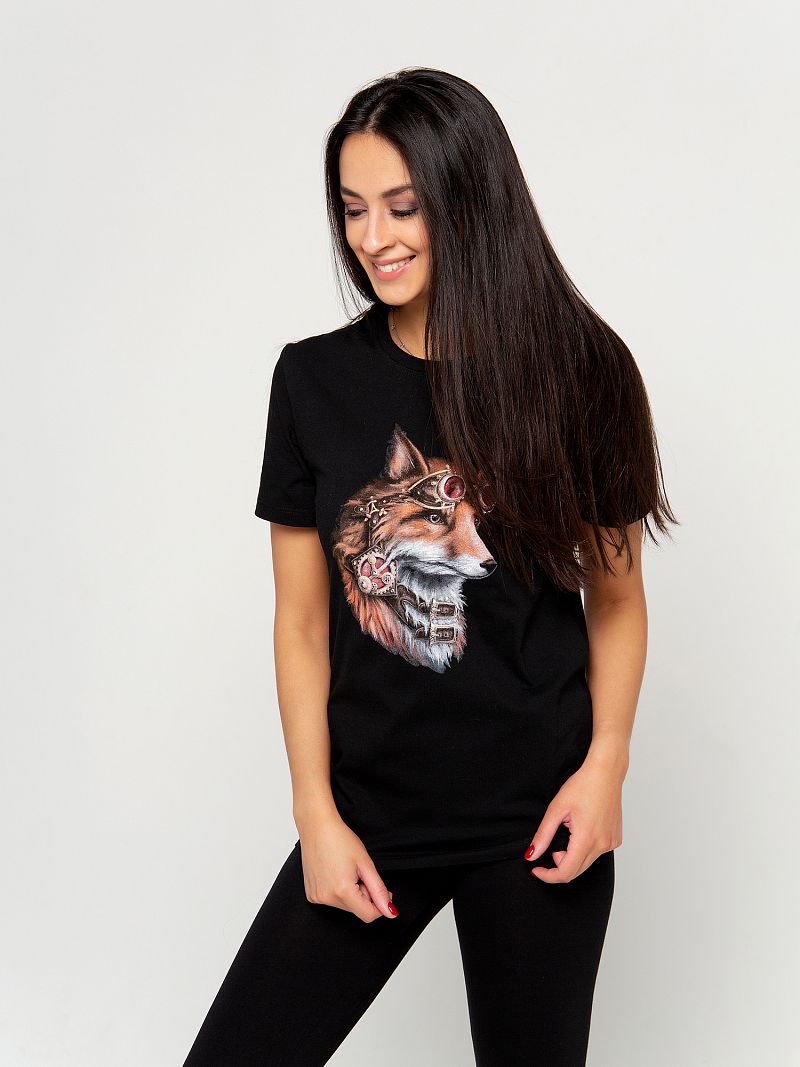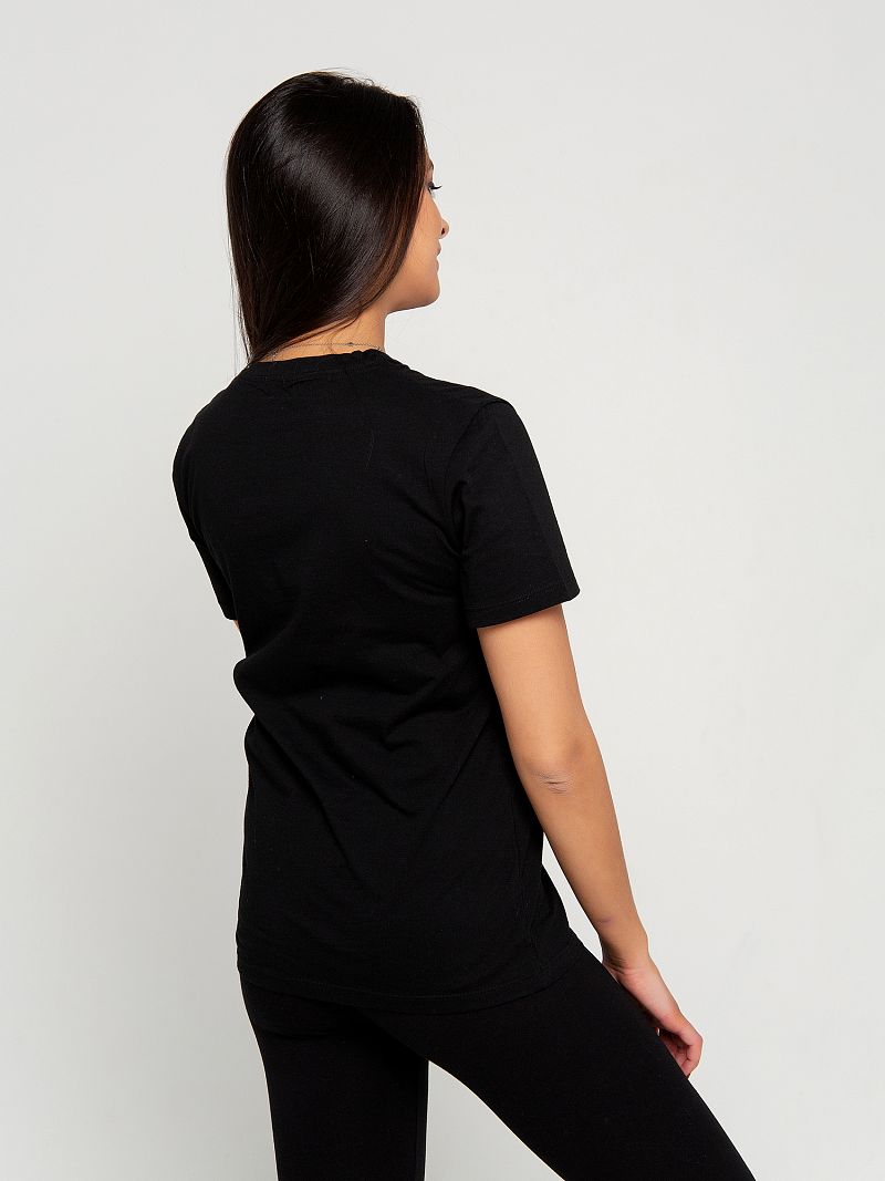 Футболка базового цвета, оформлена крупным печатным принтом. Рукав короткий. Горловина округлая. Ткань - трикотаж, характеризующийся мягкостью и эластичностью. Состав: 100% хлопок. Длина изделия 66 см. Рост модели на фото 173 см.