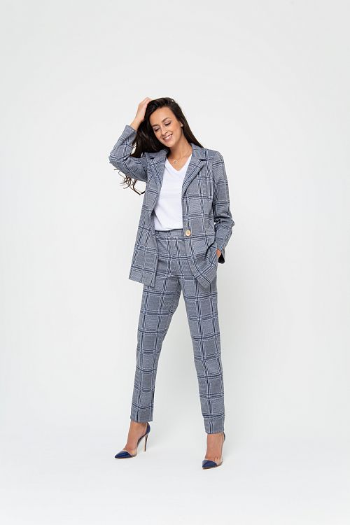 Классические брюки, выполненные в сдержанной цветовой гамме. Модель оформлена принтом "в клетку" по всей длине. Изделие дополнено боковыми карманами. Данная модель - классический вариант для создания стильного делового образа. Состав: 95% тиар, 5% спандекс. Длина изделия 99 см. Рост модели на фото 173 см (+ каблук).