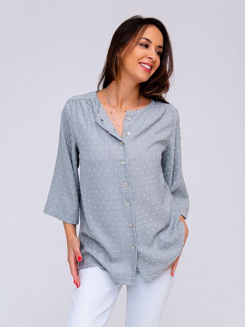 Женственная блузка свободного покроя с застежкой на пуговицы, с широкими рукавами три четверти из фактурной ткани, в насыщенном розовом или пастельном сером цветах, которую можно носить на все случаи жизни. Отлично сочетается как с брюками, так и шортами или юбкой.