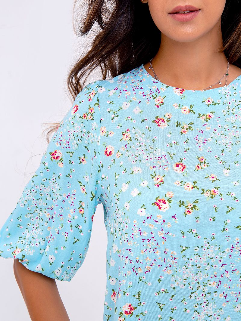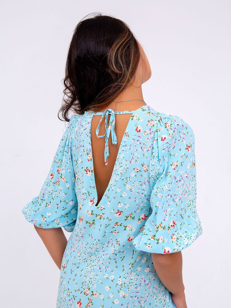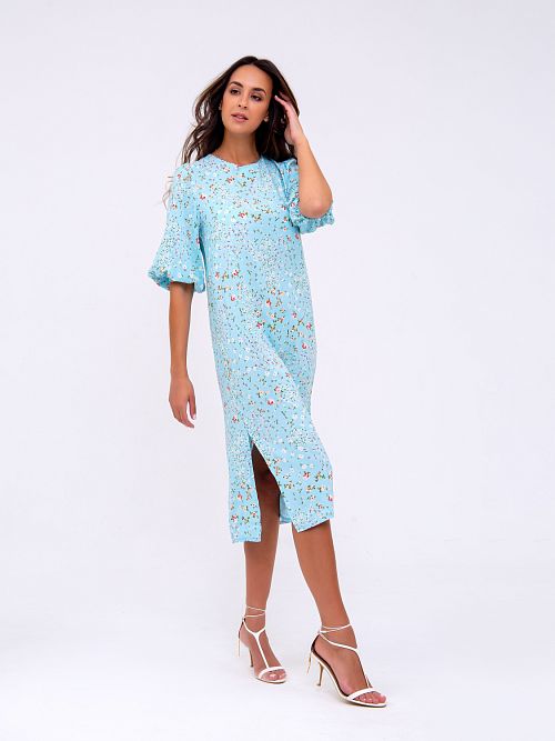 Нежное платье-миди, оформленное цветочным принтом по всей длине изделия. Модель свободного кроя с боковыми разрезами, что позволяет ткани струиться и придаёт образу лёгкости и воздушности. Рукав 3/4 на резинке. Вырез горловины округлый спереди и V-образный сзади на завязках. Ткань - штапель. Состав: 100% вискоза. Рост модели на фото 173 см (+каблук)