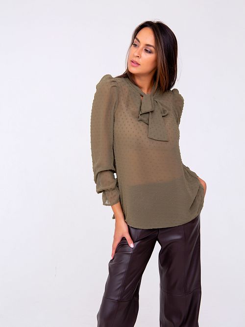 Элегантная модель блузы выполнена из невесомого шифона.Трендовый оттенок, оригинальный крой. Рукава собраны резинкой, горловина оформлена бантом. Состав: 100% полиэстер. Рекомендуем деликатную стирку.