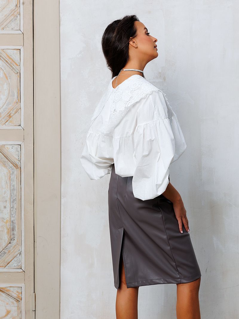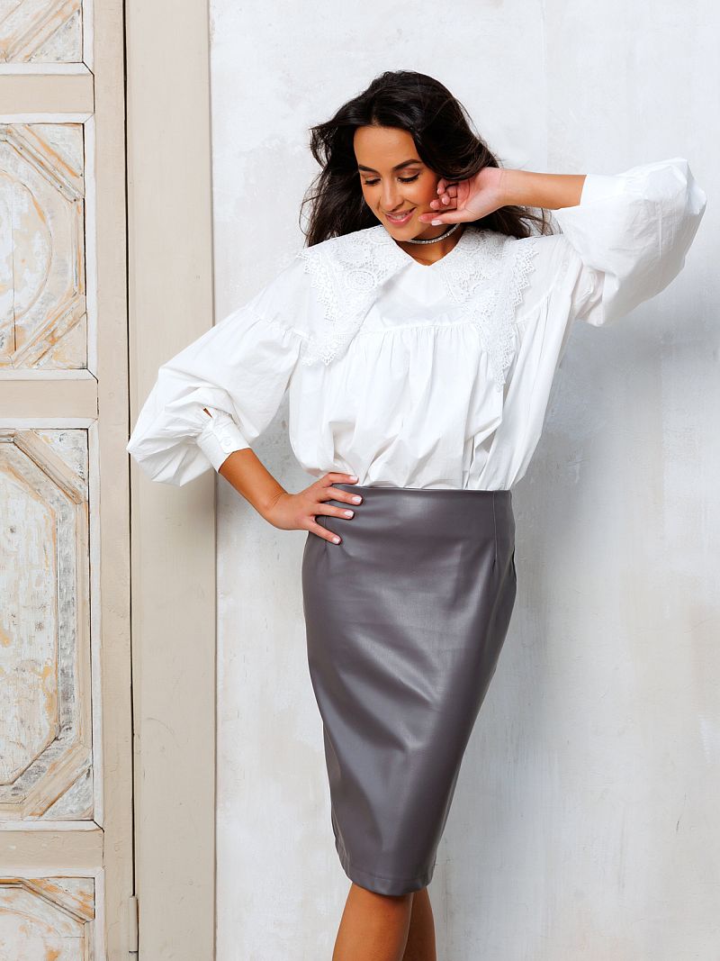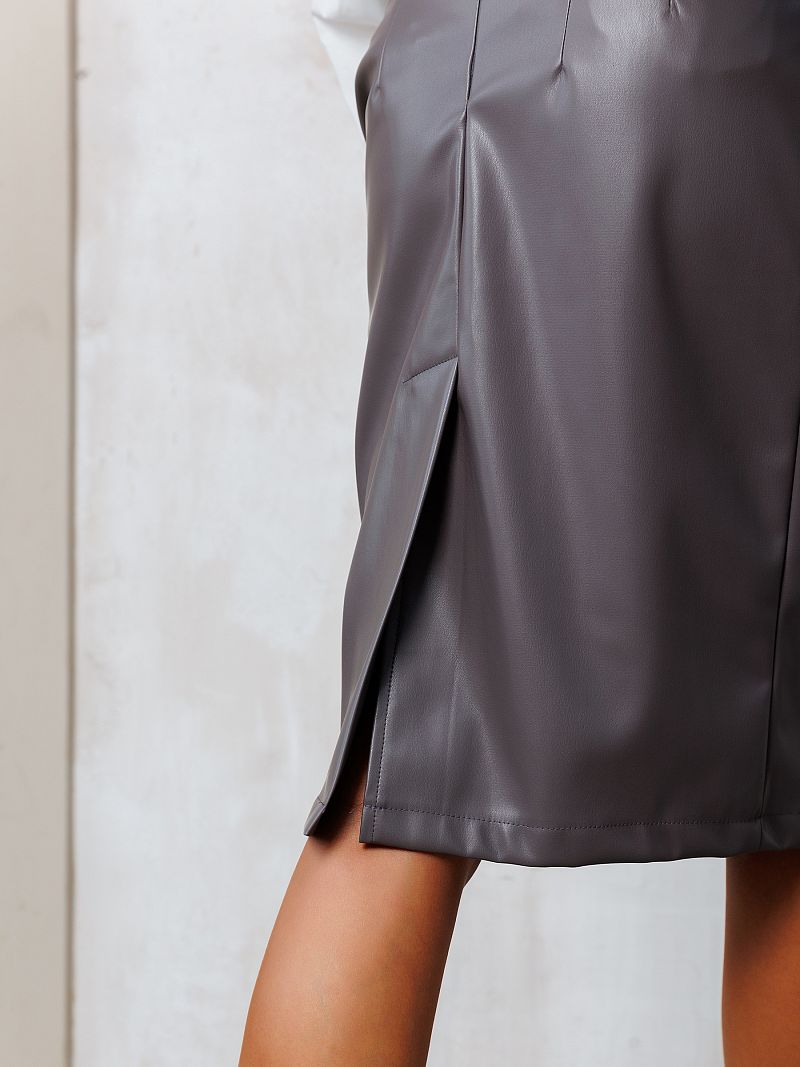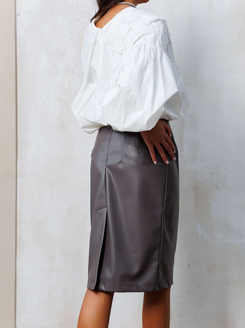 Эта серая кожаная юбка сочетает в себе элегантность классического стиля и смелость современной моды. Серый цвет, который всегда в тренде, делает эту юбку универсальной и легко сочетаемой со всеми оттенками гардероба.
