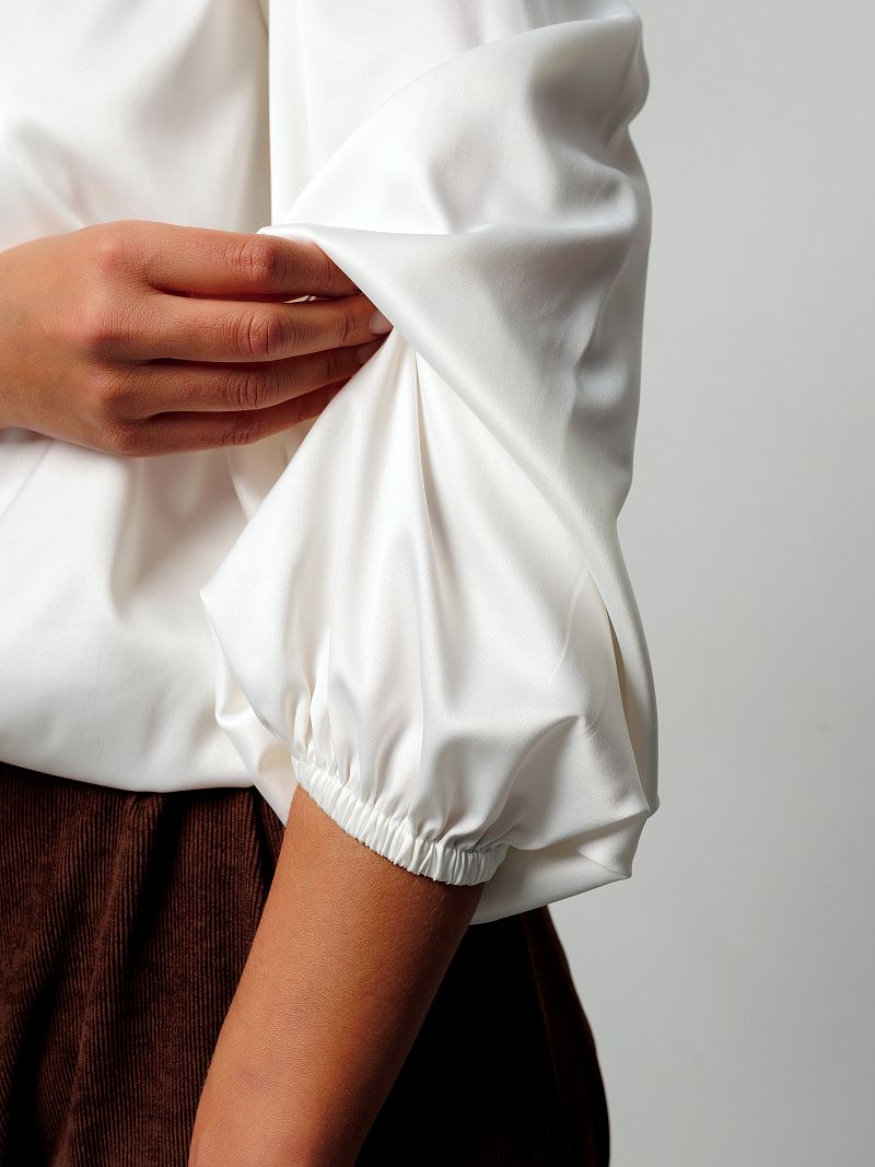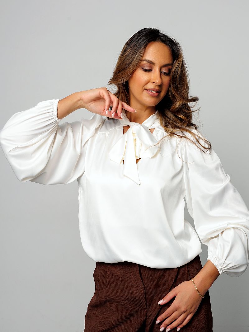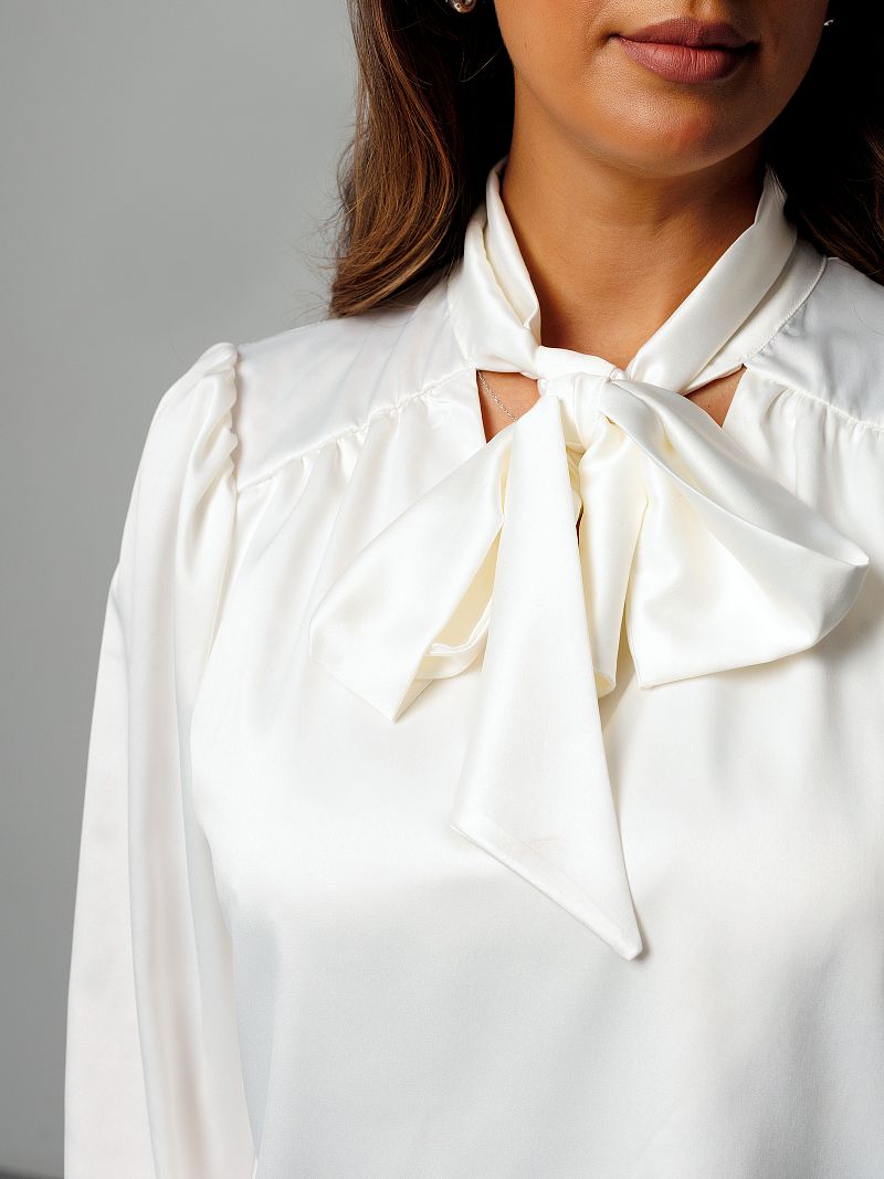 Блузка женская Raposa - это модное и универсальное решение для создания как офисного, так и вечернего образа. Эта блузка нарядная, сшитая из шелк атласа премиум качества, отличается гладкой фактурой и приятным ощущением на коже. Ее удлиненный крой и свободный покрой оверсайз делают ее комфортной для ношения в течение всего дня, а также идеально подходит для беременных и женщин с пышными формами плюс сайз до 54 и 56 размера. Белая блузка имеет корректирующий эффект и доступна в различных размерах, включая большие размеры, и подойдет как для высоких девушек, так и для женщин стандартного роста. Модель украшена бантом на шее, который придает особый шарм, изысканность и романтичность. Блузка с воротником с завязками делает красивый акцент в Вашем наряде. Длинные рукава фонарики, которые можно подвернуть, создают ощущение легкости и комфорта. Блузка прекрасно сочетается как с юбками, так и с брюками, а также может быть надета под пиджак для создания более делового образа. Фасон блузы классический, он полностью соответствует дресс коду, подойдет для учебы девочке подростку. Универсальность дизайнерской однотонной блузки позволяет использовать ее как для офиса или школы, для учителя, так и для праздничных мероприятий, например, на корпоратив, день рождения или на свадьбу, подружкам невесты. Благодаря быстросохнущему и дышащему материалу, блузка обеспечивает комфорт в любое время года. Она не мнется, что делает ее идеальным вариантом для путешествий и активного образа жизни. Эта винтажная блузка станет прекрасным дополнением к вашему гардеробу и поможет создать трендовый образ в стиле олд мани как в пинтерест.