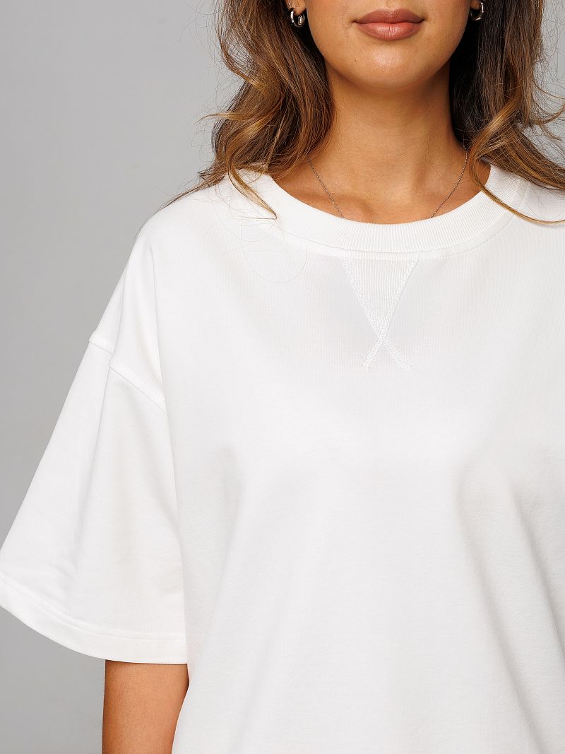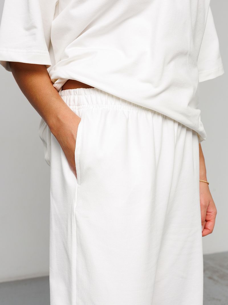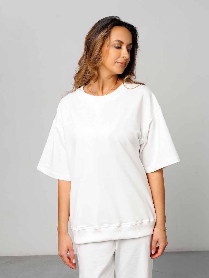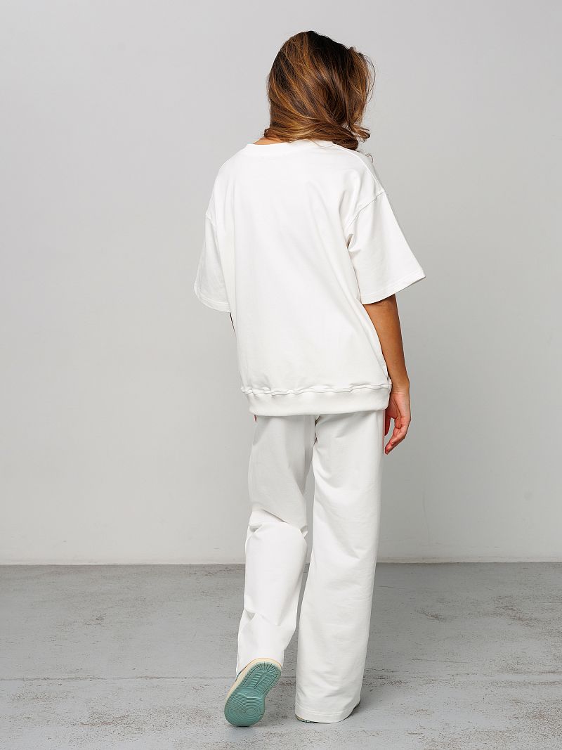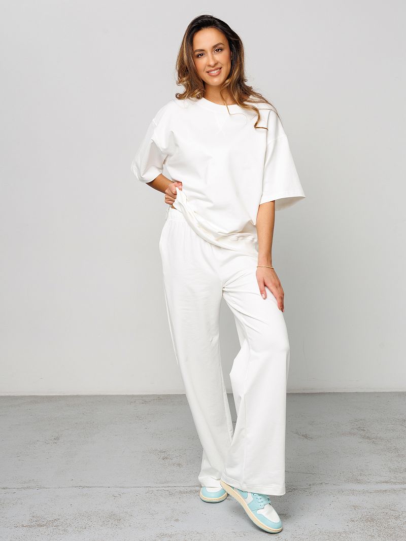 Костюм женский Raposa - это идеальное сочетание комфорта и стиля, созданное специально для современных женщин, ценящих практичность и удобство. Этот брючный костюм, выполненный из дышащего футера двунитка премиум качества, подарит вам ощущение легкости и свободы движений в течение всего дня. Состав ткани - 95% хлопка и 5% лайкры - обеспечивает приятную тактильную текстуру и мягкость. Модель брюк палаццо - широкие, с прорезными карманами, создает актуальный образ. Футболка с рукавом 3/4 дополняет комплект, делая его универсальным для различных ситуаций. Комплект спорт шик представлен в белом цвете, что позволяет легко комбинировать его с другими предметами гардероба и создавать нарядный праздничный вид каждый день. Благодаря своей универсальности, этот костюм y2k уместен для дома, для фитнеса и зала, прогулок или встреч с друзьями. Модель оверсайз с резинкой на талии подходит для полных женщин плюс сайз больших размеров до 58 и 60 и для беременных. Комплект со свитшотом и прямыми штанами подойдет для девочки подростка для школы, он подчеркнёт индивидуальность и скорректирует возможные недостатки фигуры. Удлиненная по спинке кофта великолепно смотрится на высоких и невысоких девушках. Этот наряд с брюками и однотонной футболкой станет незаменимым спутником в летние и весенние дни, его можно надевать как офисный деловой вариант и выглядеть безупречно.