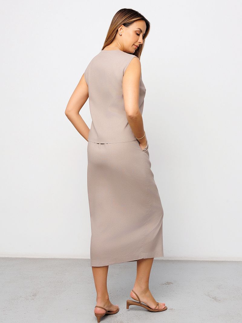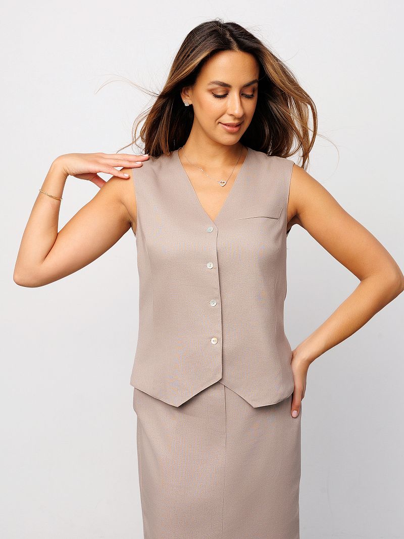 Костюм женский с юбкой и жилеткой от Raposa – стильное и комфортное решение для современных женщин 2025, ценящих элегантность и практичность. Это идеальное сочетание классики и тренда. Благородство однотонного дизайна дополняется удобством. Летний и весенний базовый костюм из дышащего и немнущегося льна станет лучшим выбором для вечерних мероприятий, деловых встреч или просто для отдыха на море. Коричневый костюм льняной с юбкой миди и однобортным жилетом поможет создать незабываемый нарядный образ в классическом стиле. Длинная юбка макси с разрезом спереди и прорезными карманами в боковом шве совместно с жилетка черная добавляют образу женственности и комфорта, а жилетка с застежкой на пуговицы придает ему особый шарм. Эргономичная резинка на поясе сзади мягко прилегает к талии без сдавливания и создает корректирующий эффект, способствуя идеальной посадке. Костюм двойка из льняного материала с добавлением вискозы обеспечивает комфорт в жаркую погоду, а его гладкая фактура приятно ощущается на коже. Модель костюма премиум качества в стиле олд мани прекрасно подойдет для женщин больших размеров плюс сайз до 54 и 56, подчеркивая достоинства фигуры и позволяя выглядеть шикарно и безупречно. Полуприлегающий силуэт этой модели удобен на весну, на лето для беременных. Костюм женский праздничный – идеальный вариант на выпускной или на свадьбу, для подружек невесты. Костюм лен прекрасно подходит на весну для учебы в колледже или университете для девочки подростка, для прогулок или как офисный костюм юбка кофта. Строгий комплект двойка с безрукавкой с глубоким V – образным вырезом поможет создать актуальный образ красивой и уверенной в себе женщины.