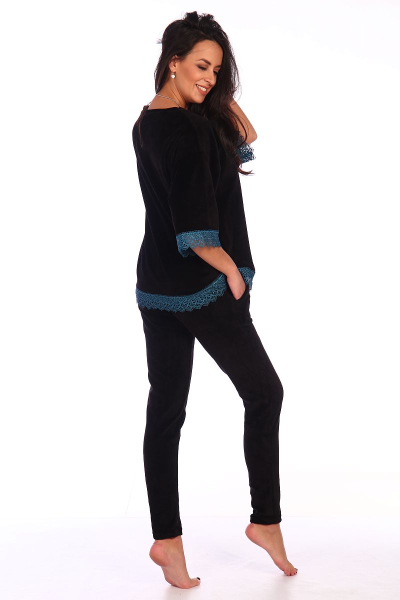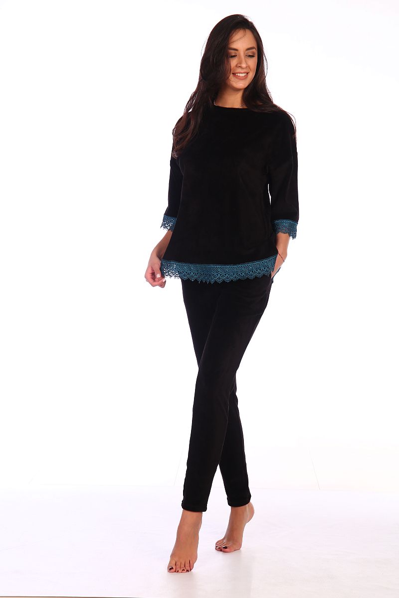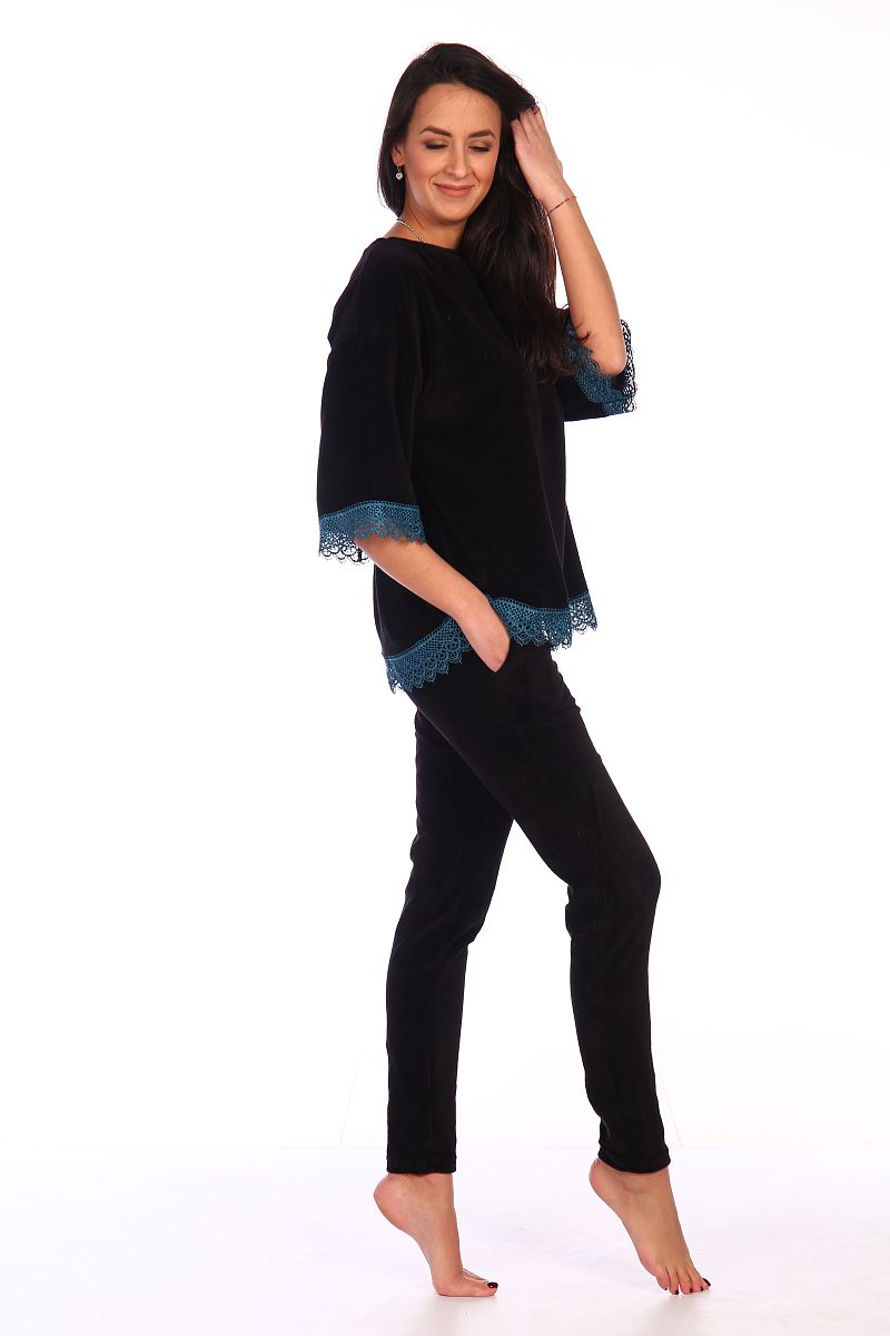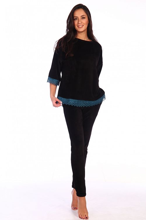 Трикотажный костюм из брюк и кофты, выполнен в лаконичной цветовой палитре. Кофта и брюки из мягкого и комфортного к телу велюра. Кофточка приятного оттенка, украшена кружевными вставками на рукавах и по низу изделия. Рукав 3/4, свободного кроя. Брюки лаконичного дизайна, без манжет. Состав: 100% хлопок. Длина кофты 65 см, длина брюк 94 см.. Рост модели на фото 173 см.