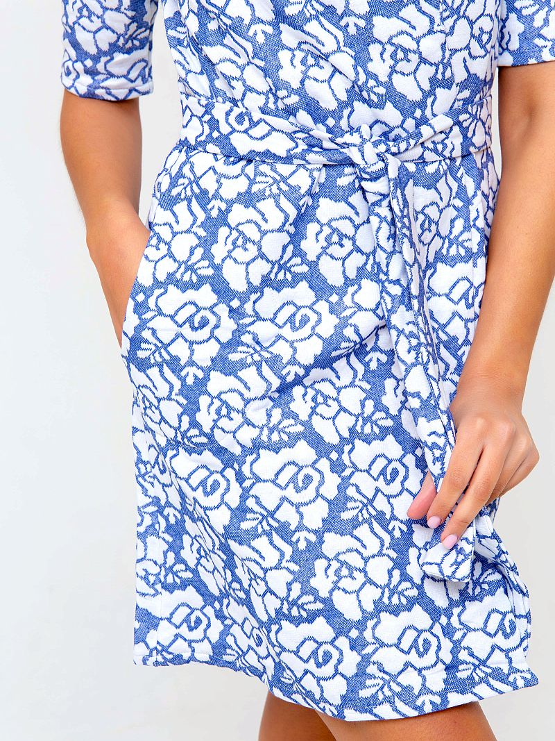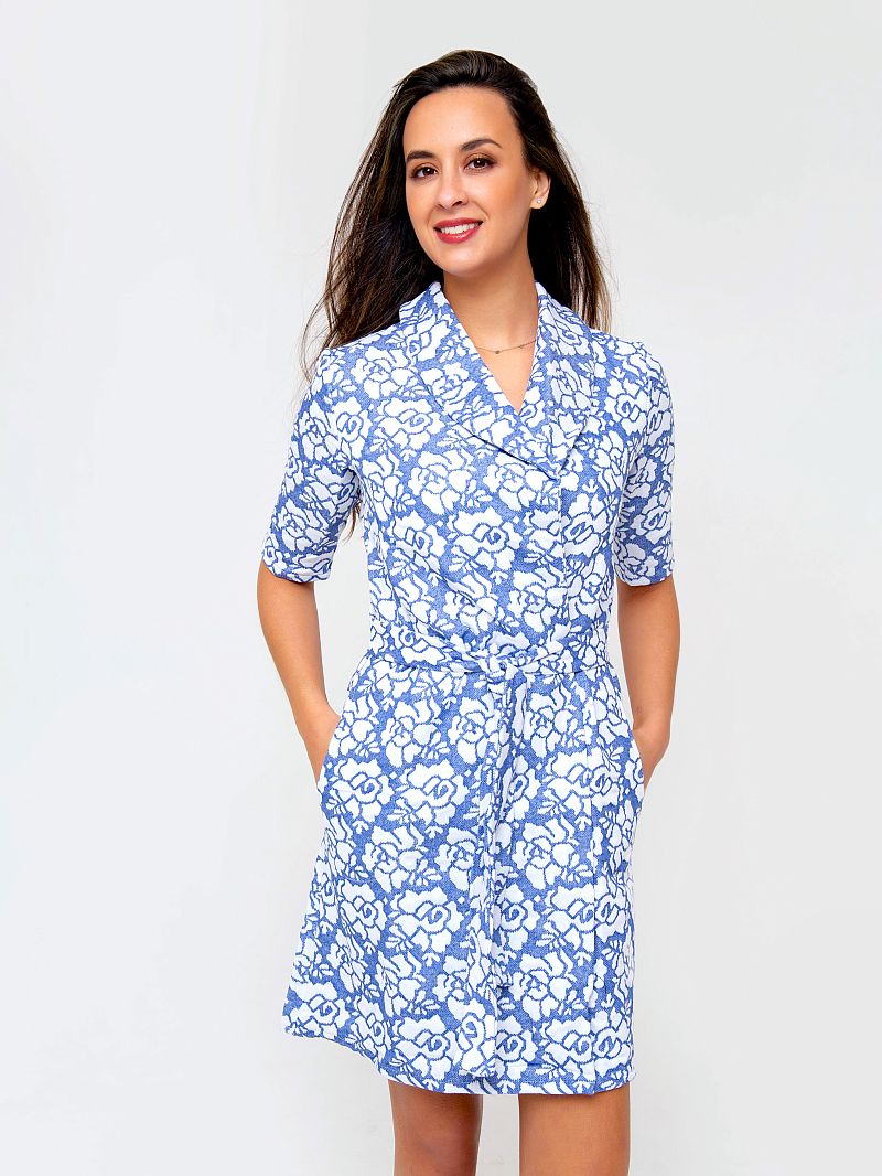 Халат из приятного к телу материала. Модель выполнена в сдержанной цветовой гамме, оформлена контрастным цветочным принтом по всей длине изделия. Халат на запах, в комплекте идет пояс. Изделие дополнено боковыми карманами. Рукав короткий. Ткань - трикотаж, который идеально подойдет для домашнего использования. Состав: 100% хлопок. Длина изделия 89 см. Рост модели на фото 173 см.