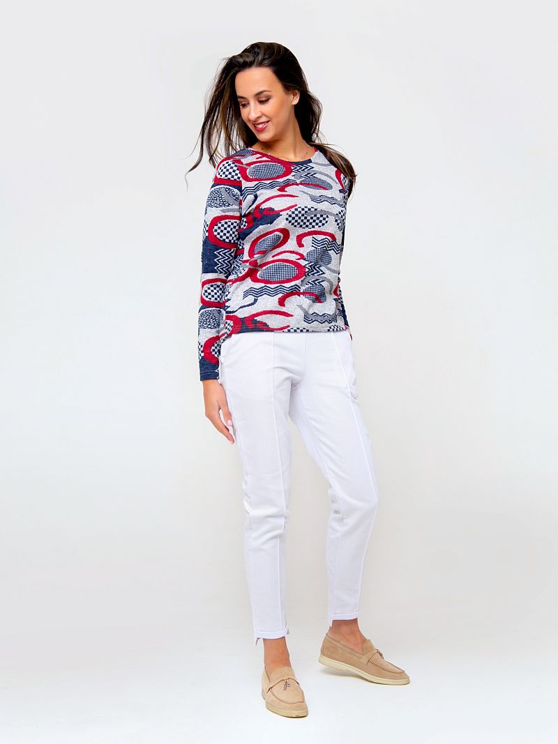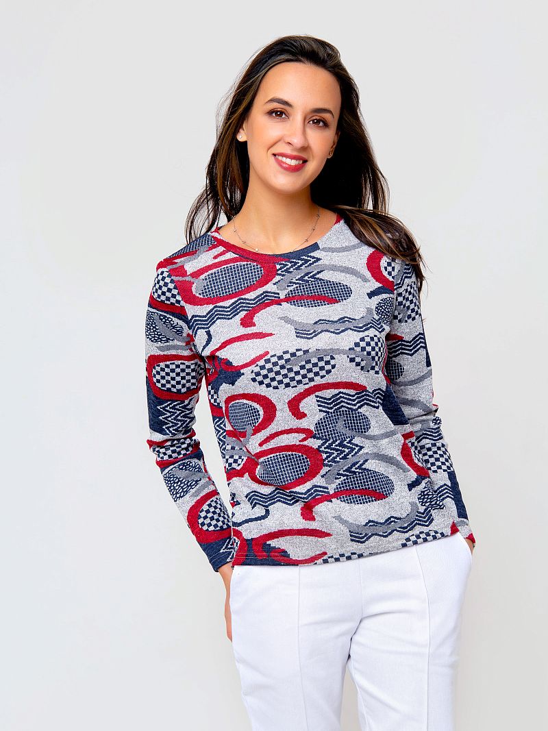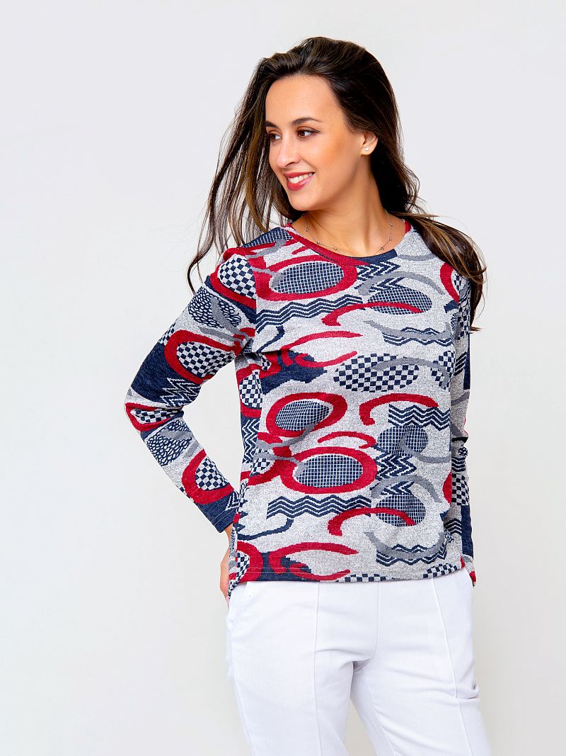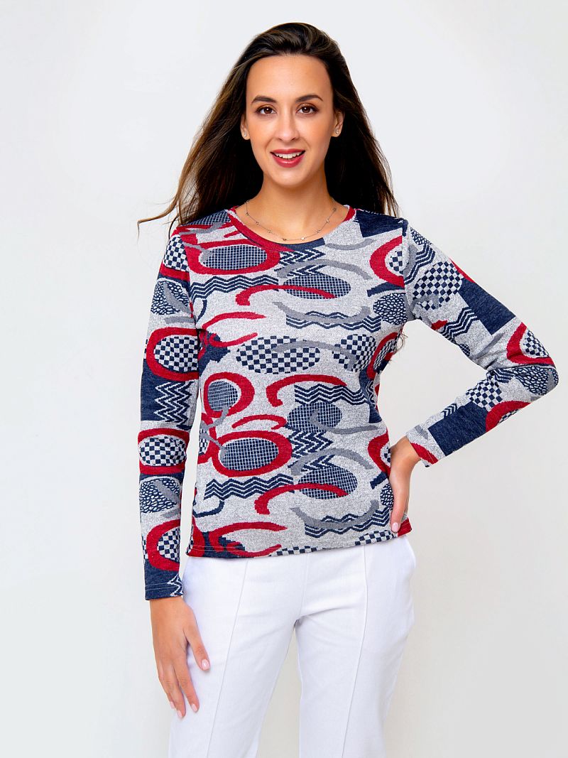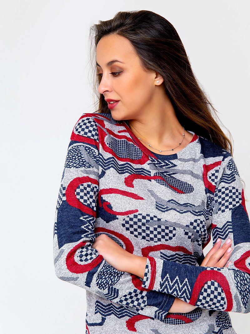 Трикотажный джемпер из приятного к телу материала. Модель оформлена контрастным абстрактным рисунком по всей длине изделия, что делает модель запоминающейся. Рукав длинный. Вырез горловины - округлый. Состав: 95% полиэстер, 5% эластан. Длина изделия 59 см . Рост модели на фото 173 см.