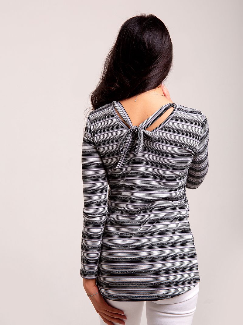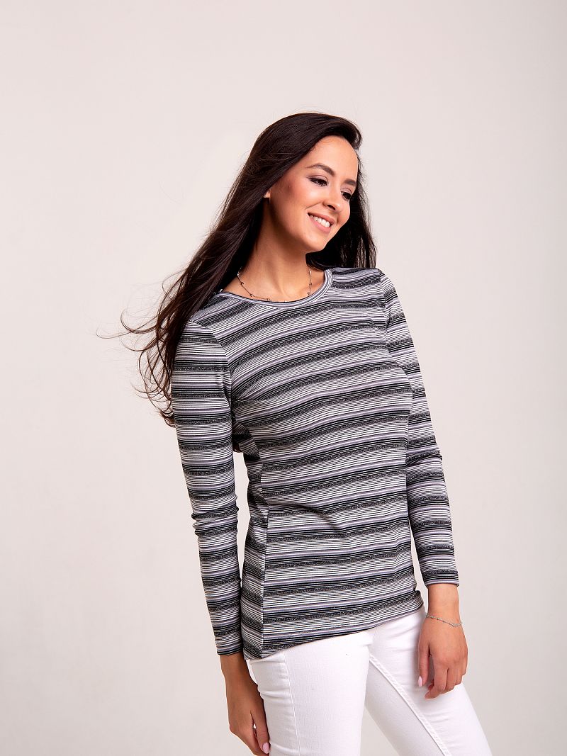 Трикотажный джемпер, выдержанный в спокойной цветовой гамме. Модель оформлена принтом "в полоску" по всей длине изделия. Рукав длинный. Вырез горловины округлый. Материал - трикотаж, который характеризуется мягкостью и растяжимостью. Модель прекрасно подойдет для формирования повседневного гардероба. Состав: 15% ангора, 80% полиэстер, 5% эластан. Длина изделия . Рост модели на фото 173 см.