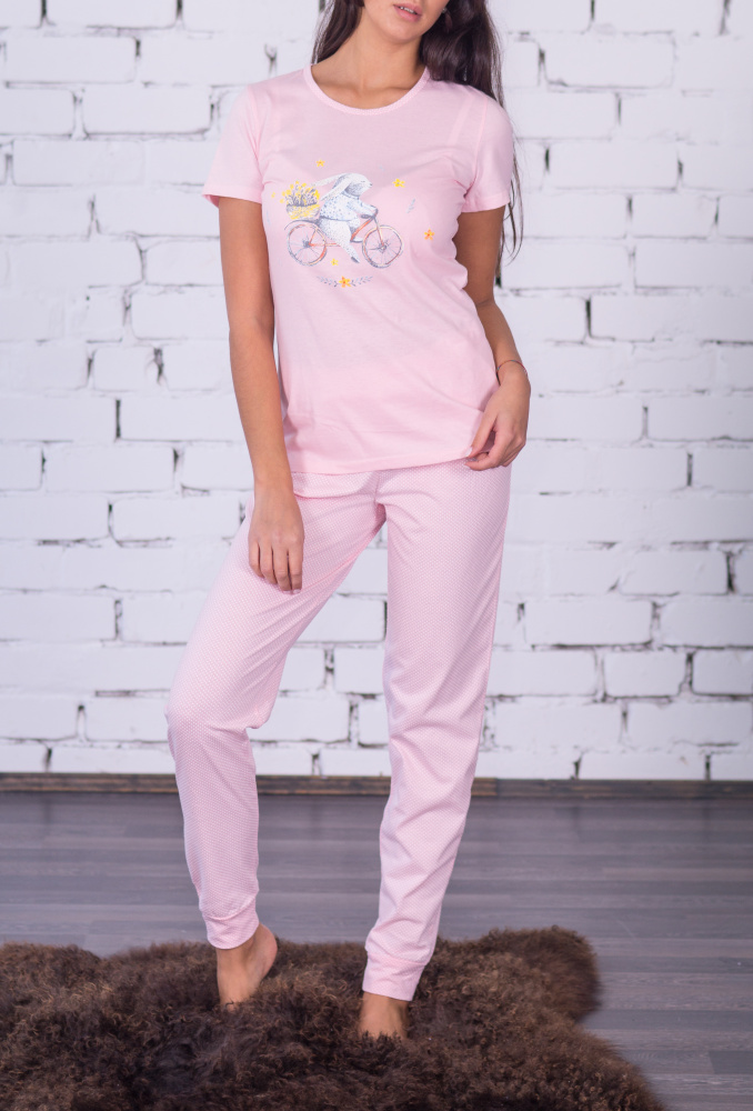 Пижама из приятного к телу трикотажного полотна, выполнена в нежнейшей цветовой гамме. Пижама состоит из футболки и брюк. Футболка оформлена крупным милым принтом. Рукав короткий. Горловина округлая. Брюки однотонные, лаконичного дизайна, дополнены манжетами. Состав: 100% хлопок. Длина футболки 64 см, длиина брюк 100 см. Рост модели на фото 173 см.