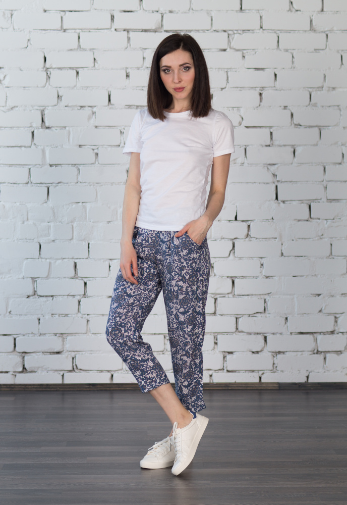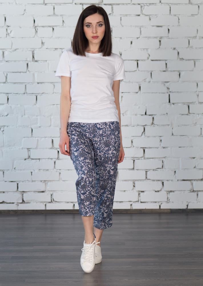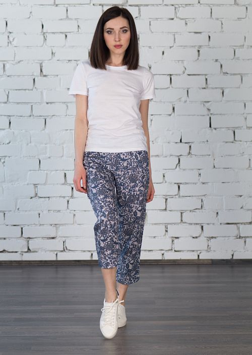 Пижама трикотажная, в комплект которой входят футболка и капри. Белая однотонная футболка - незаменимый элемент базового гардероба. Рукав короткий. Горловина округлая. Капри оформлены узором с растительными мотивами по всей длине изделия. Капри дополнены боковыми карманами.