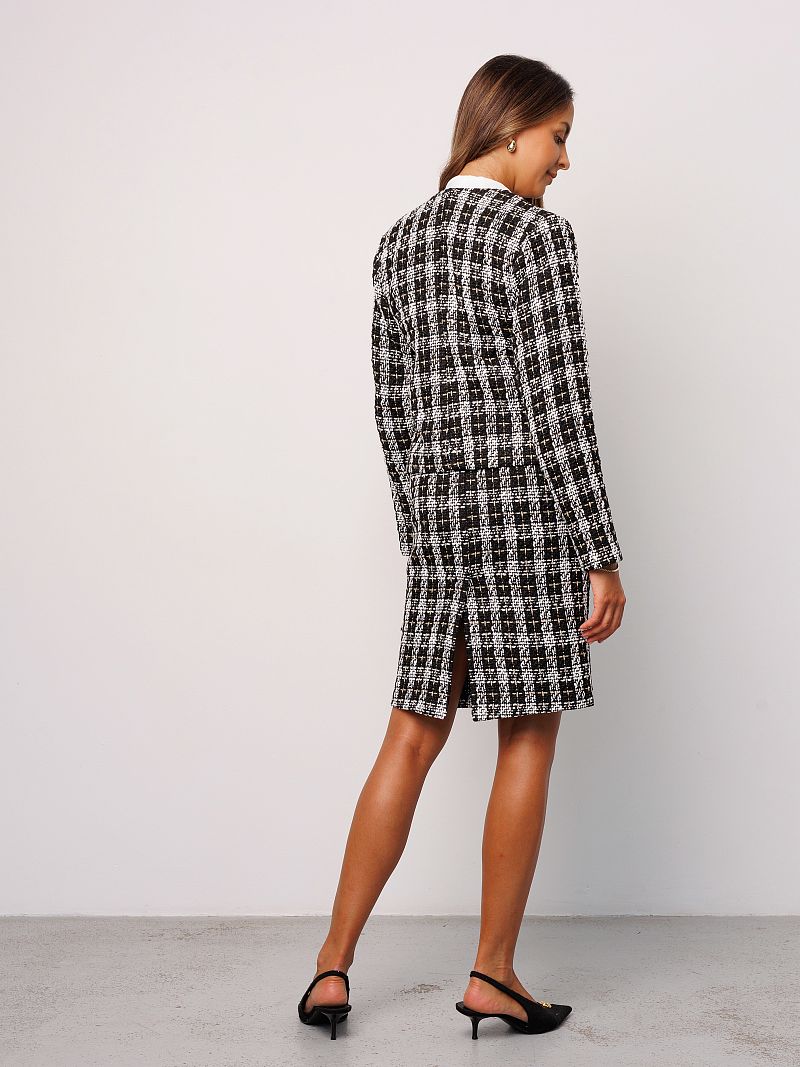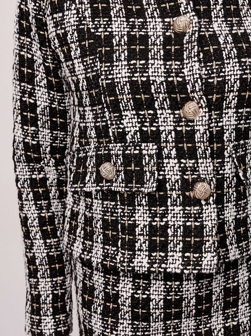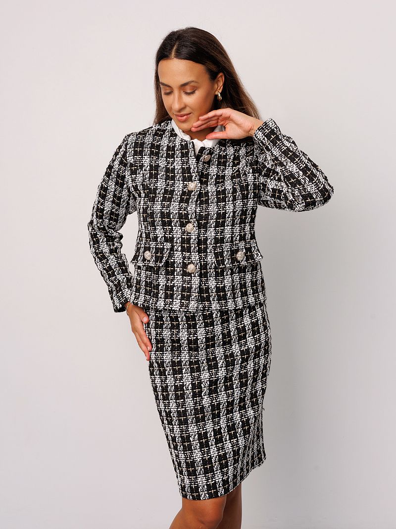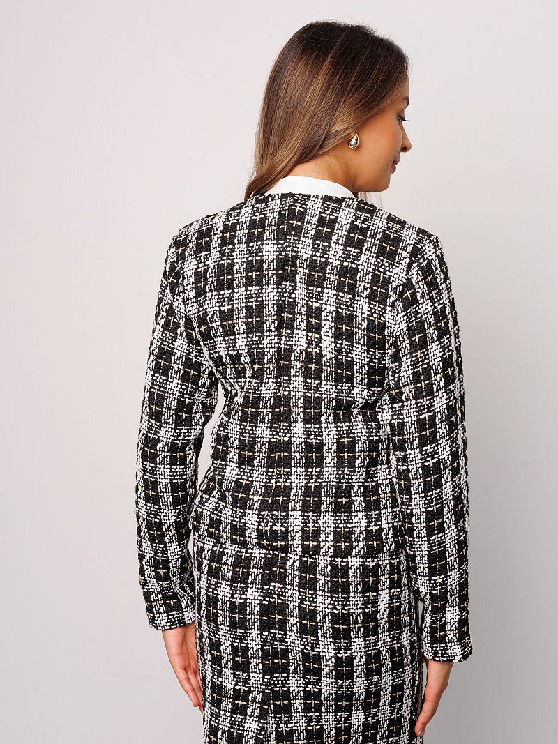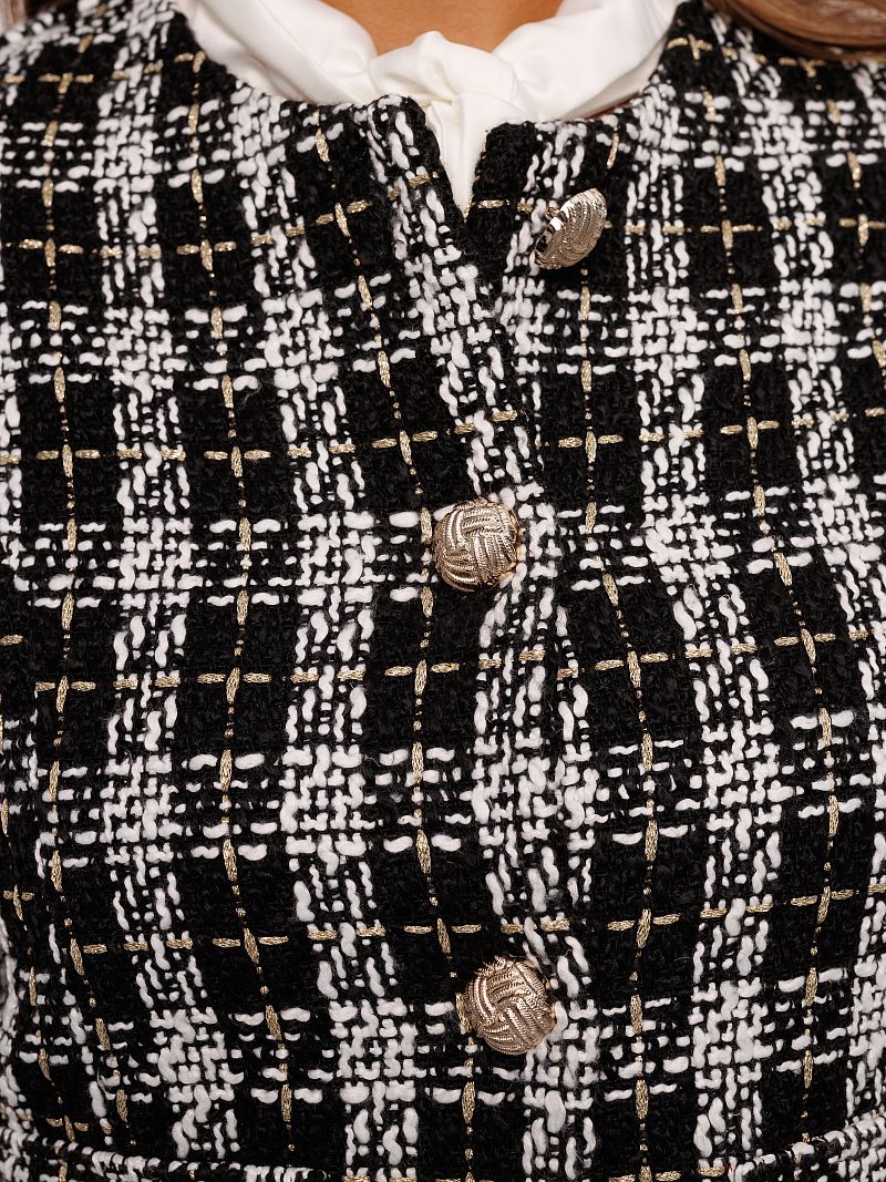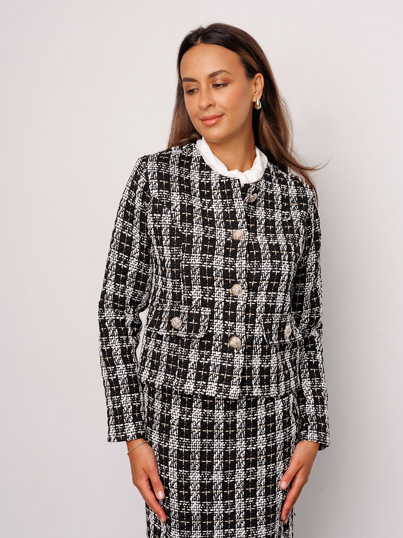 Жакет женский в клетку от Raposa - это стильное и универсальное решение для создания как офисного, школьного, так и вечернего образа. Модель выполнена из качественного твида, который придает изделию особую текстуру и теплоту. Укороченный крой и классический покрой с плечами делают жакет шанель актуальным для девушек и женщин, предпочитающих современный и элегантный стиль. Пиджак женский твидовый украшен золотыми пуговицами, которые добавляют образу нотку шика и роскоши. Благодаря своей универсальности, жакет трикотажный подходит для офиса, для школы, а также как нарядный для вечерних мероприятий. В нем Вы будете чувствовать себя комфортно и уверенно в любой ситуации. Длинные рукава, уплотненные плечи и отсутствие подкладки делают его идеальным вариантом для демисезонного периода и создают безупречный силуэт. Кофта пиджак идеально садится на любую фигуру и подходит для девочек подростков, а также для женщин больших размеров плюс сайз до 54 и 56 размеров. Модный короткий пиджак придает современный и динамичный вид, а клетчатый рисунок подчеркивает оригинальность и безупречный вкус своей обладательницы. Пиджак черный пинтерест с легкостью комбинируется с любыми вещами из Вашего гардероба, создавая как строгие, так и более свободные эстетичные осенние образы в стиле олд мани или кэжуал. Куртка пиджак теплая и сделает комфортными прогулки в прохладную погоду.