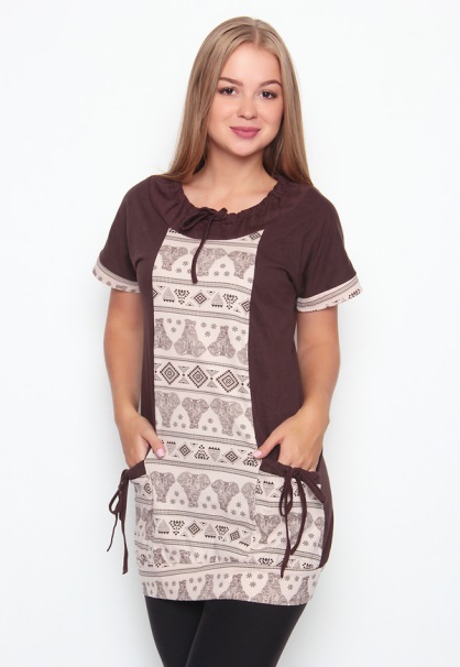 Туника в контрастном цветовом решениии, выполненная из приятного к телу и эластичного трикотажного полотна. Перед изделия оформлен принтом-орнаментом, спинка выдержана в однотонной контрастной цветовой гамме. Рукав короткий. Вырез горловины округлый, обрамлен сборкой и кулиской. Изделие дополнено накладными боковыми карманами. Состав: 100% хлопок. Длина изделия 76 см. Рост модели на фото 168 см.