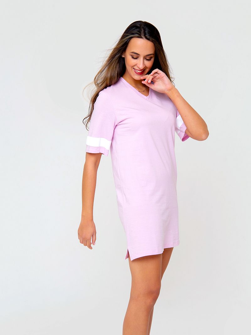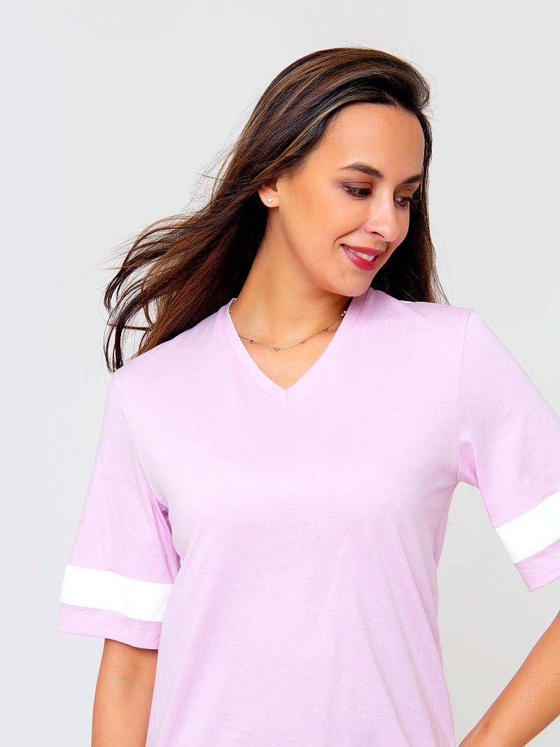 Туника из трикотажного полотна, выполнена в нежной цветовой гамме. Рукав короткий, декорирован вставкой контрастного цвета. Вырез горловины V-образный. Ткань - трикотаж, который не только приятен к телу, но и удобен и практичен в носке. Состав: 100% хлопок. Длина изделия 89 см. Рост модели на фото 173 см.