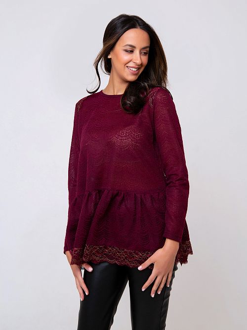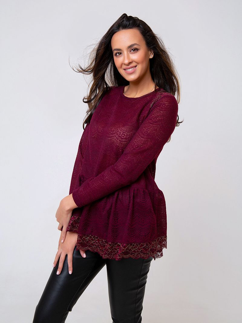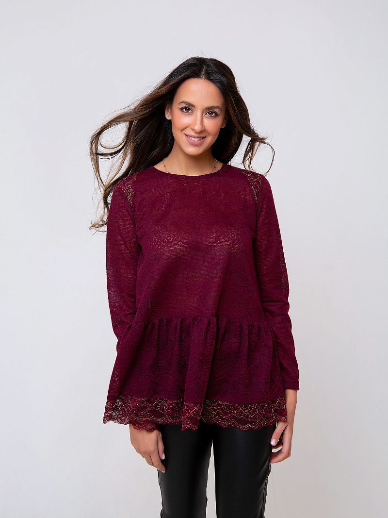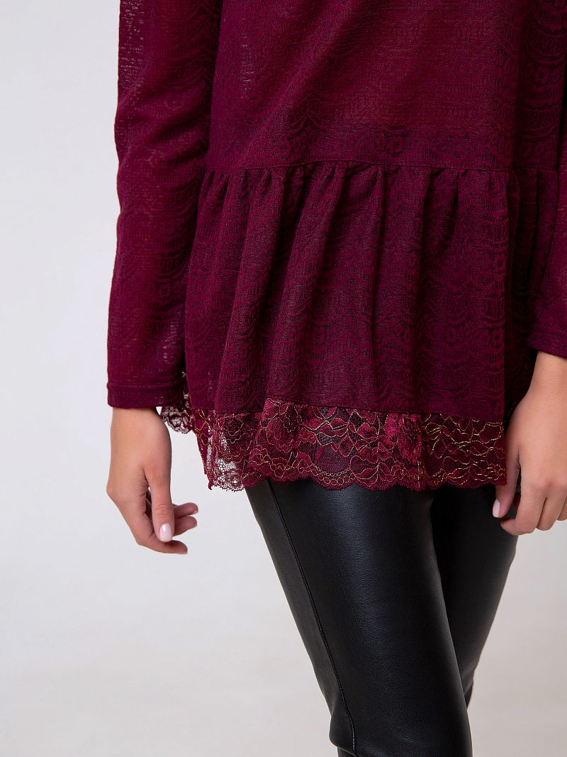 Туника женская глубокого оттенка, выполнена из полупрозрачного материала. Модель однотонная, оформлена резинкой на талии, а также вставкой из гипюра по краю изделия. Рукав длинный. Горловина округлая. Состав: 75% полиэстер, 20% вискоза 5% эластан. Длина изделия 65 см. Рост модели на фото 173 см (+ каблук).