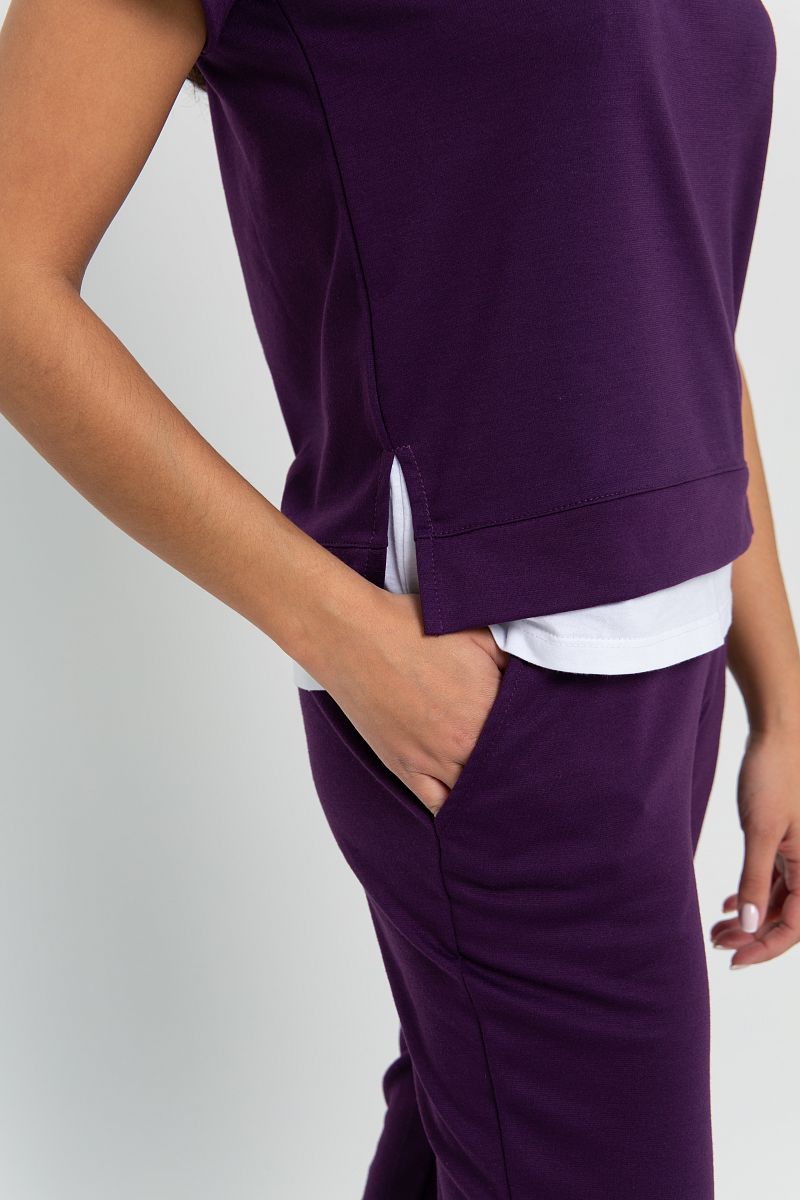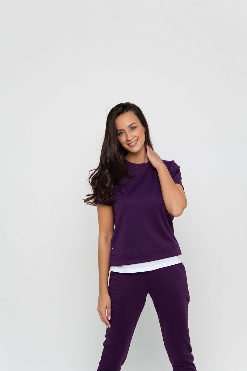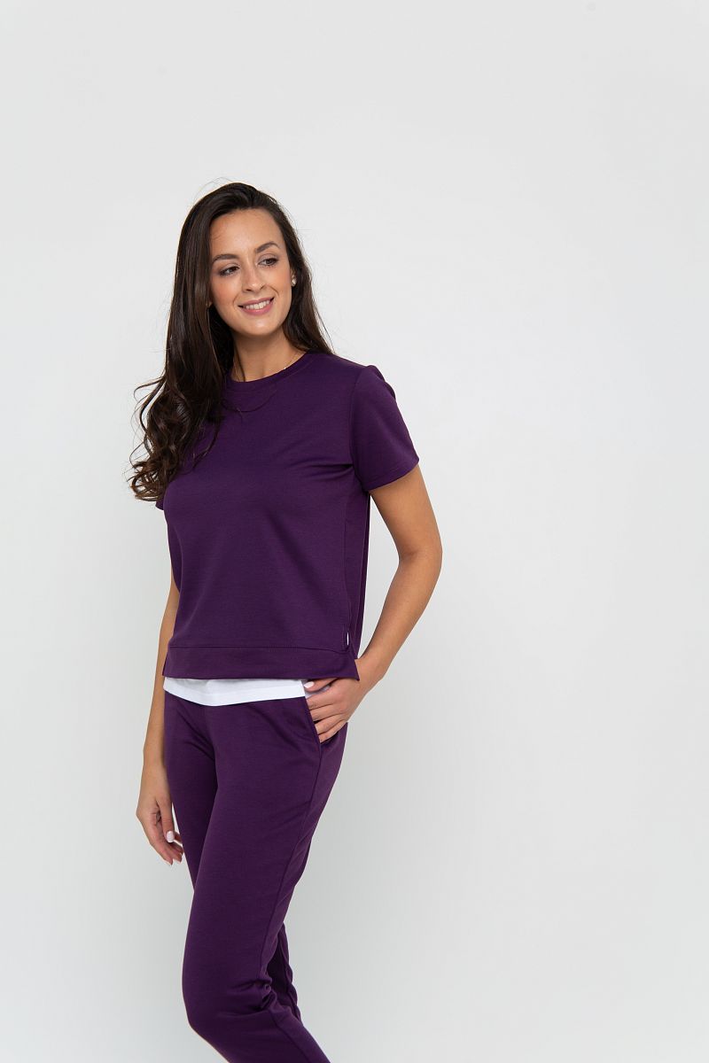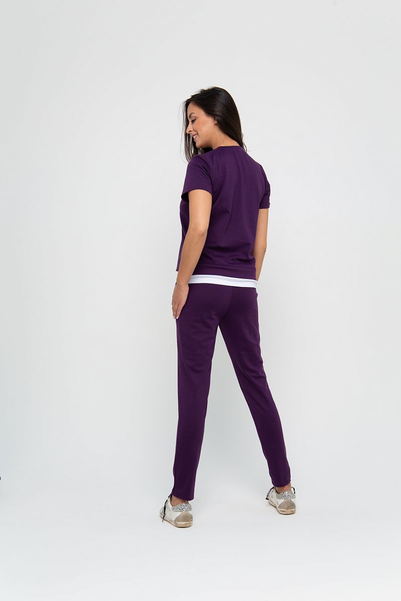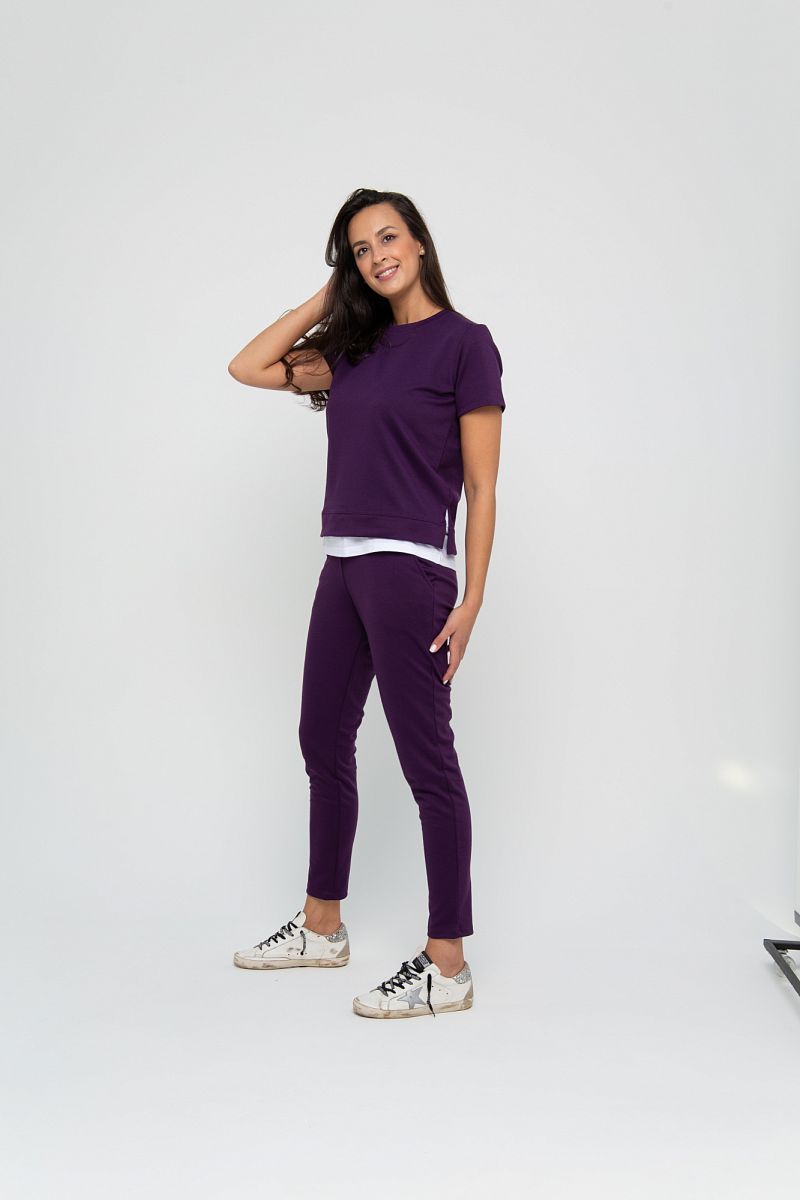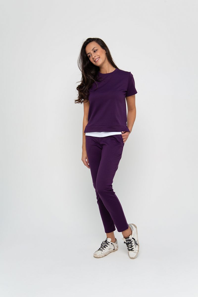 Стильный костюм насыщенного оттенка, выполнен из приятного к телу трикотажа. Костюм состоит из футболки и брюк. Футболка с имитацией "двойки". Рукав короткий. Горловина округлая. Брюки лаконичного дизайна, дополнены боковыми карманами, без манжет. Такая модель идеально впишется в повседневный образ. Состав: 100% хлопок. Длина футболки 65 см, длина брюк 100 см. Рост модели на фото 173 см.