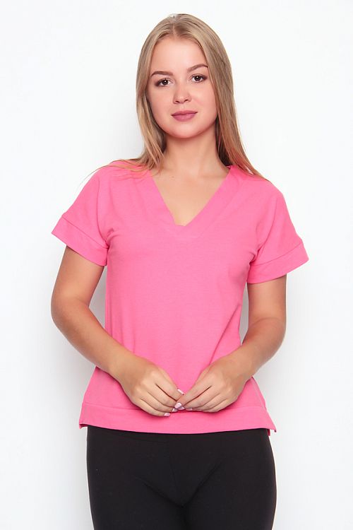 Практичная футболка лаконичного дизайна. Модель выполнена в приятной нежной расцветке. Рукав короткий. Вырез горловины V-образный. Ткань - трикотажное полотно, обладающее мягкостью и растяжимостью. Состав: 100% хлопок. Длина изделия 54 см. Рост модели на фото 168 см.