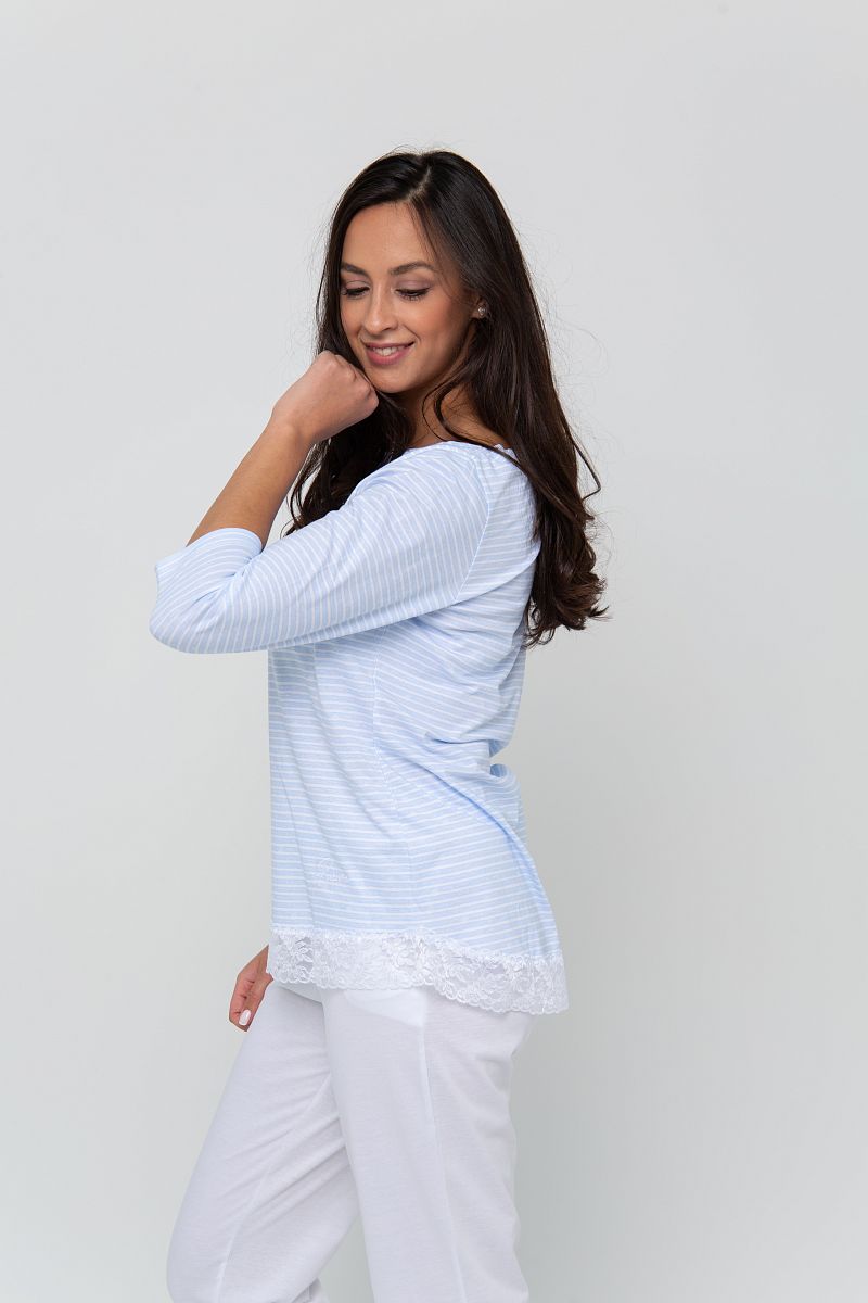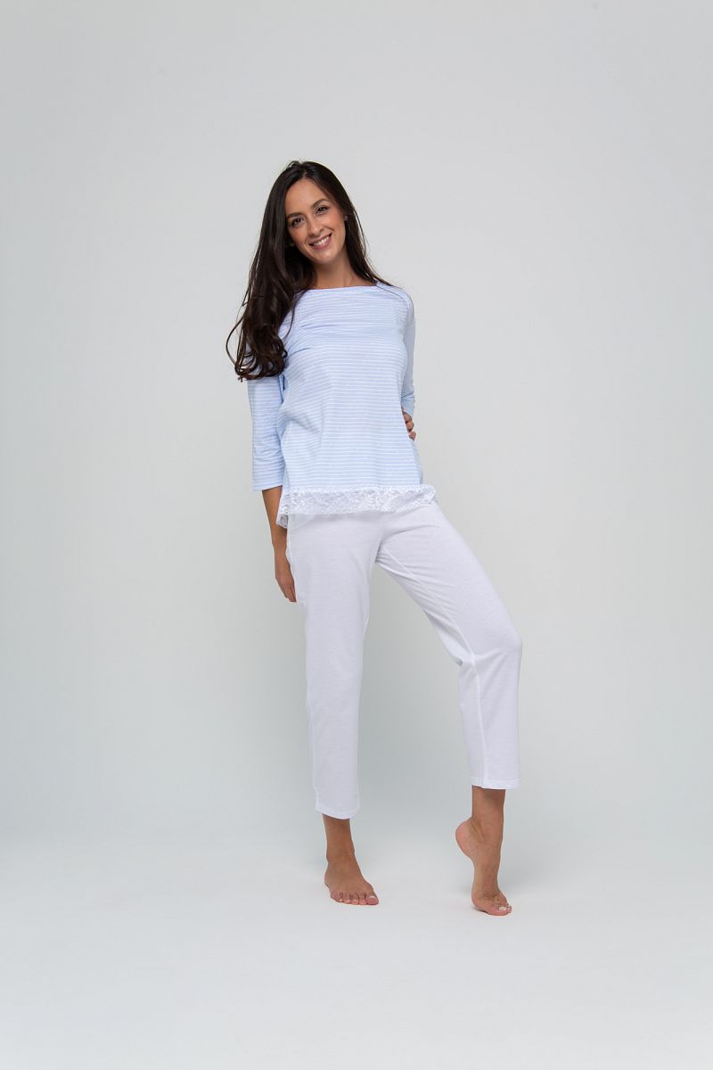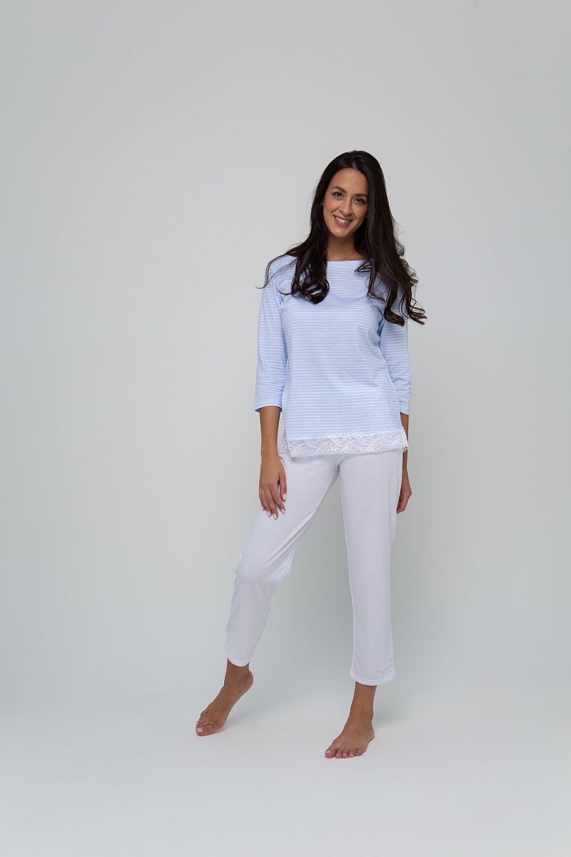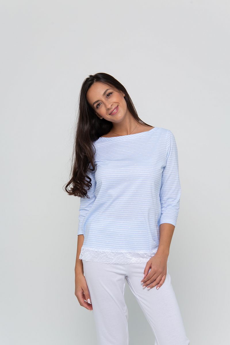 Нежный трикотажный костюм, состоящий из кофты и брюк, выполнен в сдержанной цветовой гамме. Кофта со слегка ассиметричной спинкой, оформлена принтом "в полоску", а также дополнена по краю изделия вставками из гипюра, что привносит нотку романтизма. Рукав 3/4. Вырез горловины "лодочка". Брюки прямого кроя, исполнены в лаконичном дизайне, пояс на мягкой резинке. Состав: 100% хлопок. Длина кофты 67 см., длина брюк 90 см. Рост модели на фото 173 см.