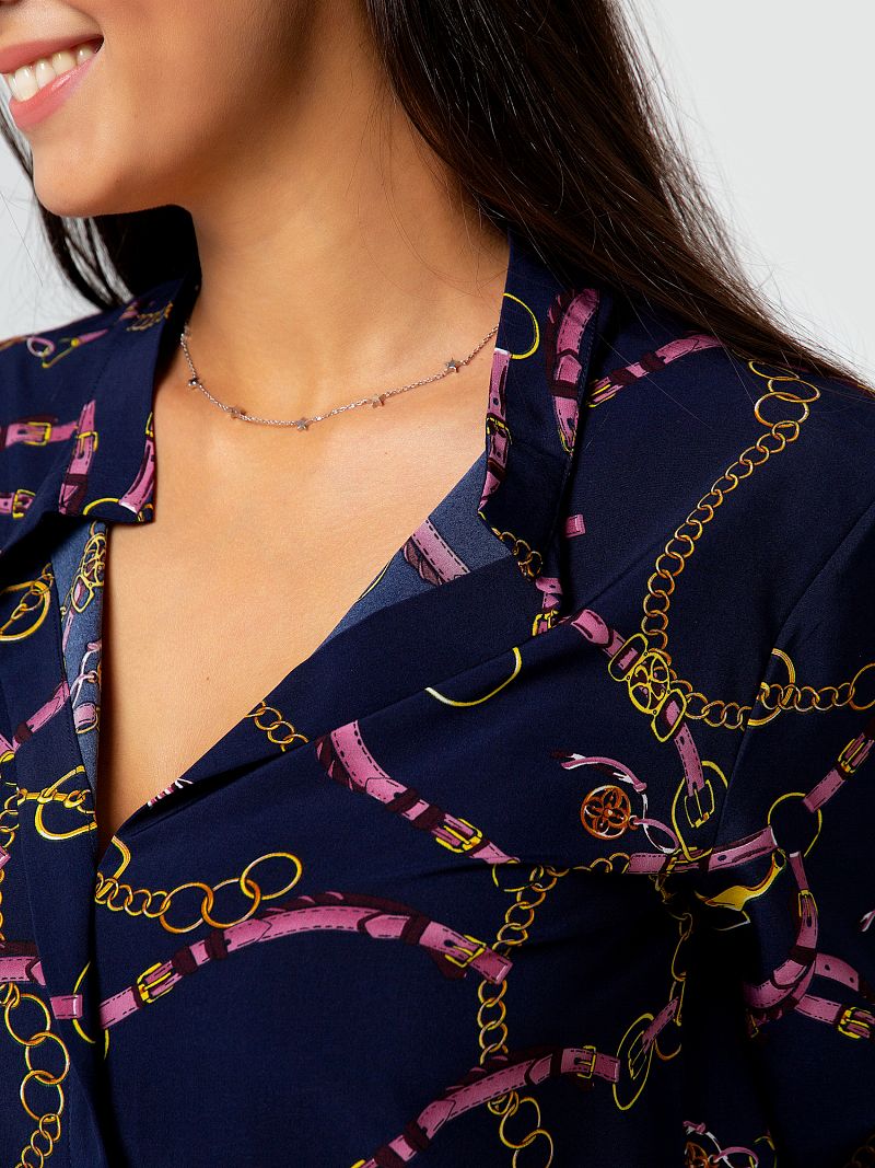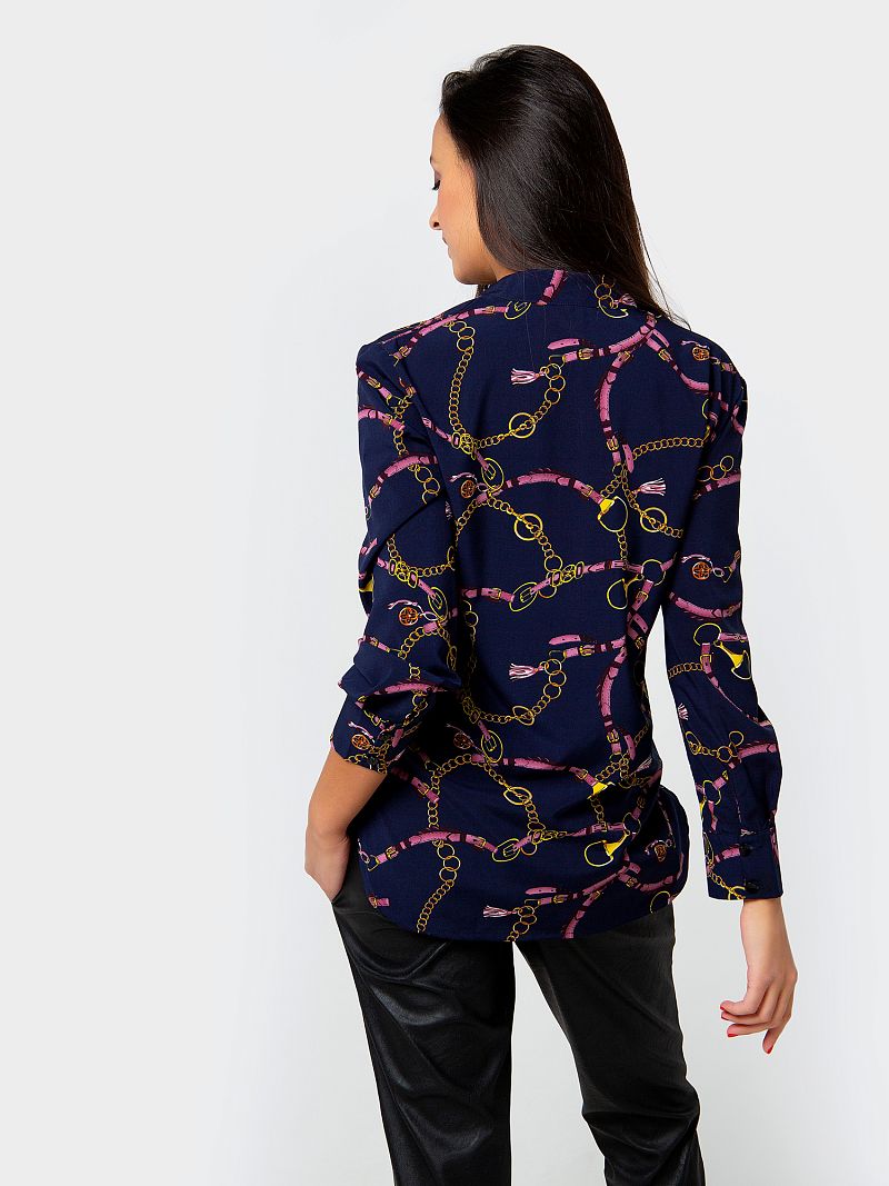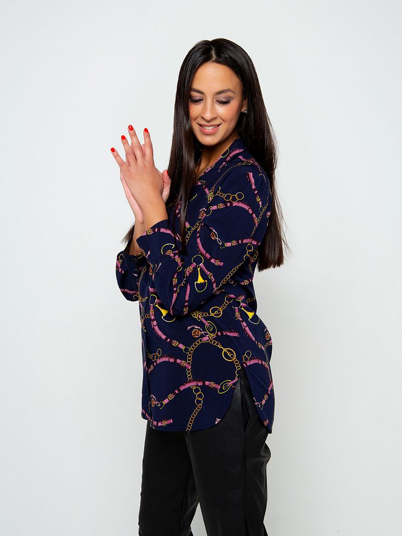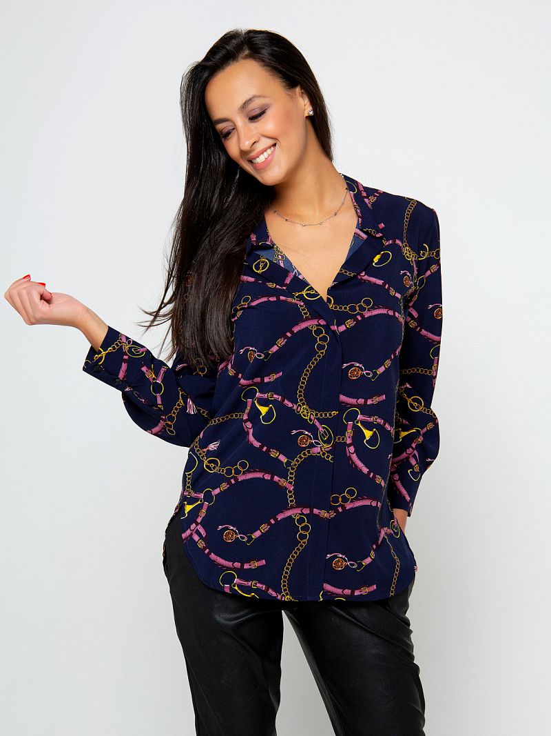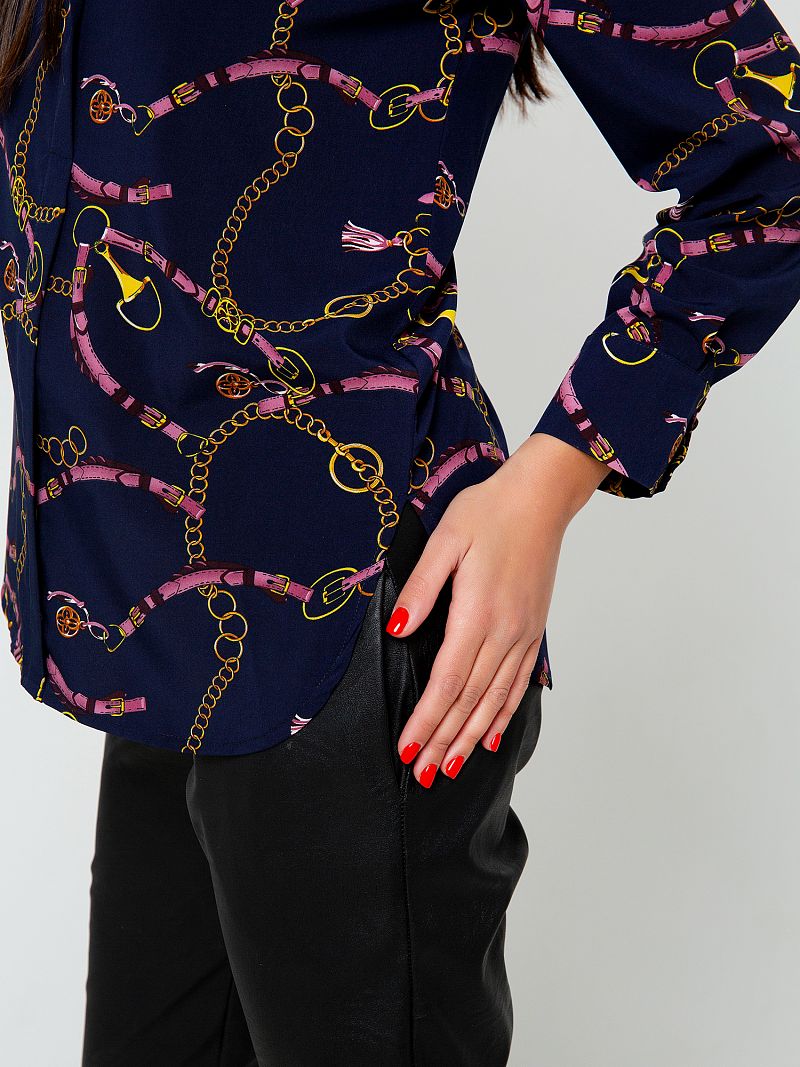 Стильная блуза прямого кроя. Глубокий сдержанный тон изделия дополняет оригинальный контрастный принт по всей длине изделия, что делает образ более выразительным. Вырез горловины V-образный, рубашечного типа. Рукав длинный. Изделие дополнено небольшими боковыми разрезами. Такая модель составит комбинацию как с юбкой, так и с брюками. Состав: 100% полиэстер. Длина изделия 80 cм. Рост модели на фото 173 см.