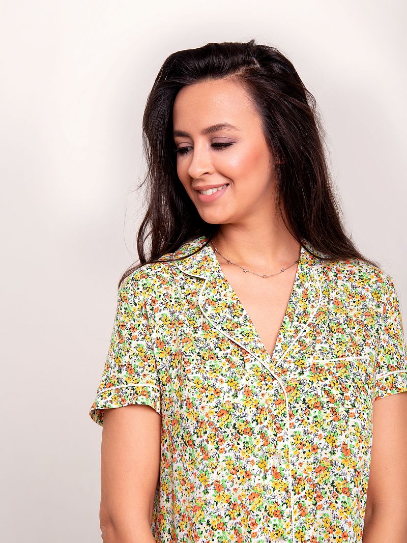 Стильный домашний костюм, состоящий из рубашки и шорт. Модель оформлена мелким цветочным принтом яркой расцветки по всей длине изделия, что добавляет настроения образу. Рубашка на пуговицах, с отложным воротничком. Рукав короткий. Шорты дополнены боковыми карманами. Состав: 100 % вискоза. Длина изделия см. Рост модели на фото 173 см.