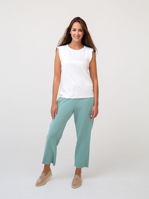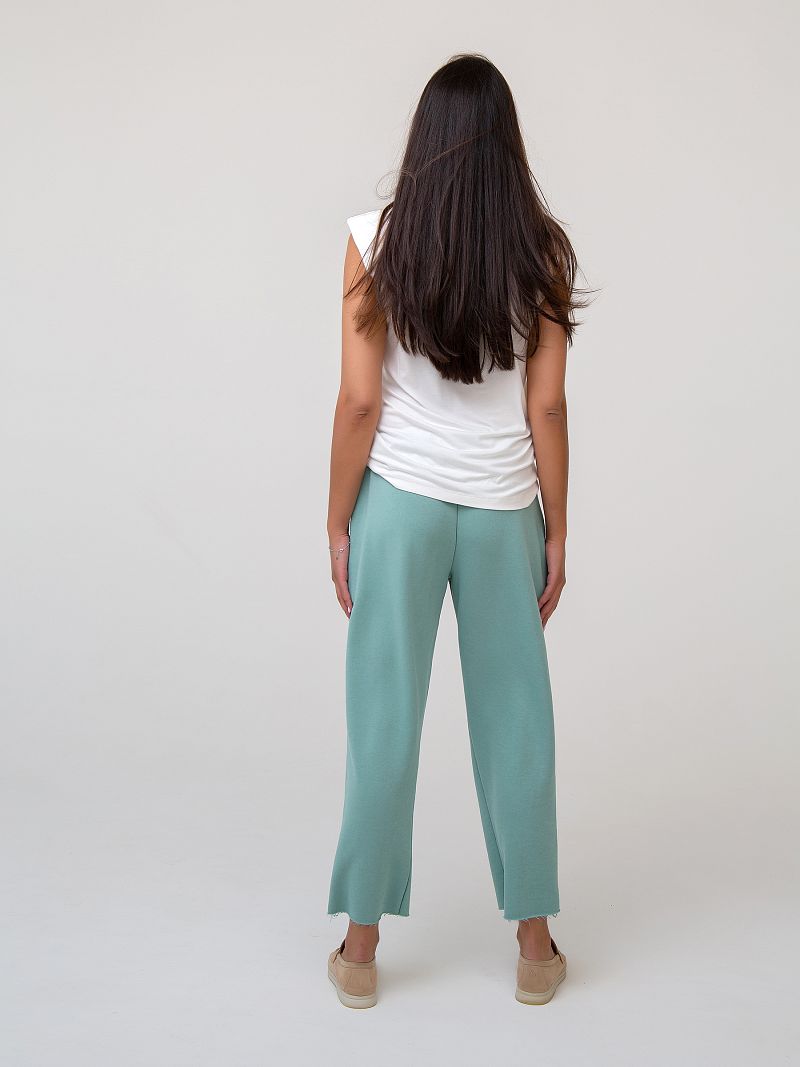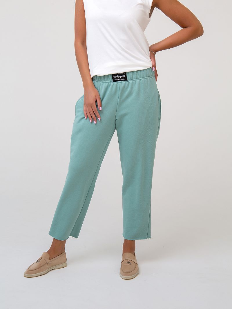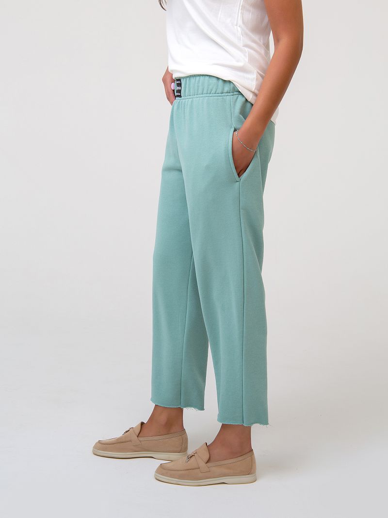Брюки укороченной модели - несомненный мастхэв этого сезона. Модель лаконичного дизайна, оформлена в нежном спокойном оттенке. Изделие на резинке, дополнено боковыми карманами. Брюки прекрасно составят комплект как с лёгким топом, так и с укороченной толстовкой. Ткань - футер 3-х нитка. Состав: 60% хлопок, 40% полиэстер. Длина изделия 91 см. Рост модели на фото 173 см
