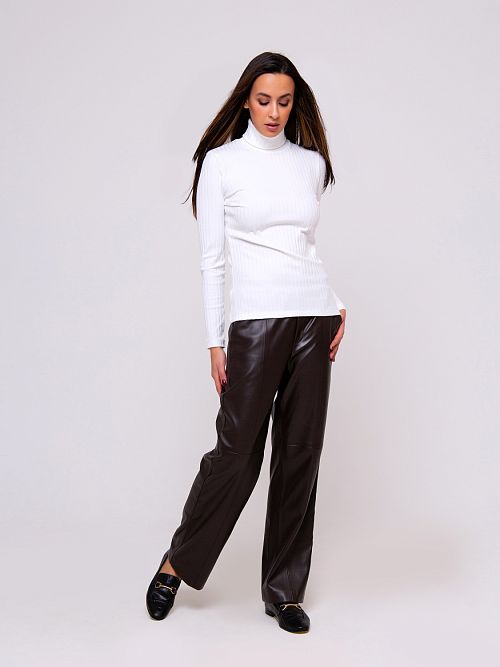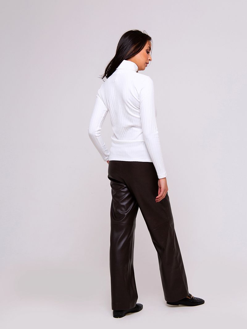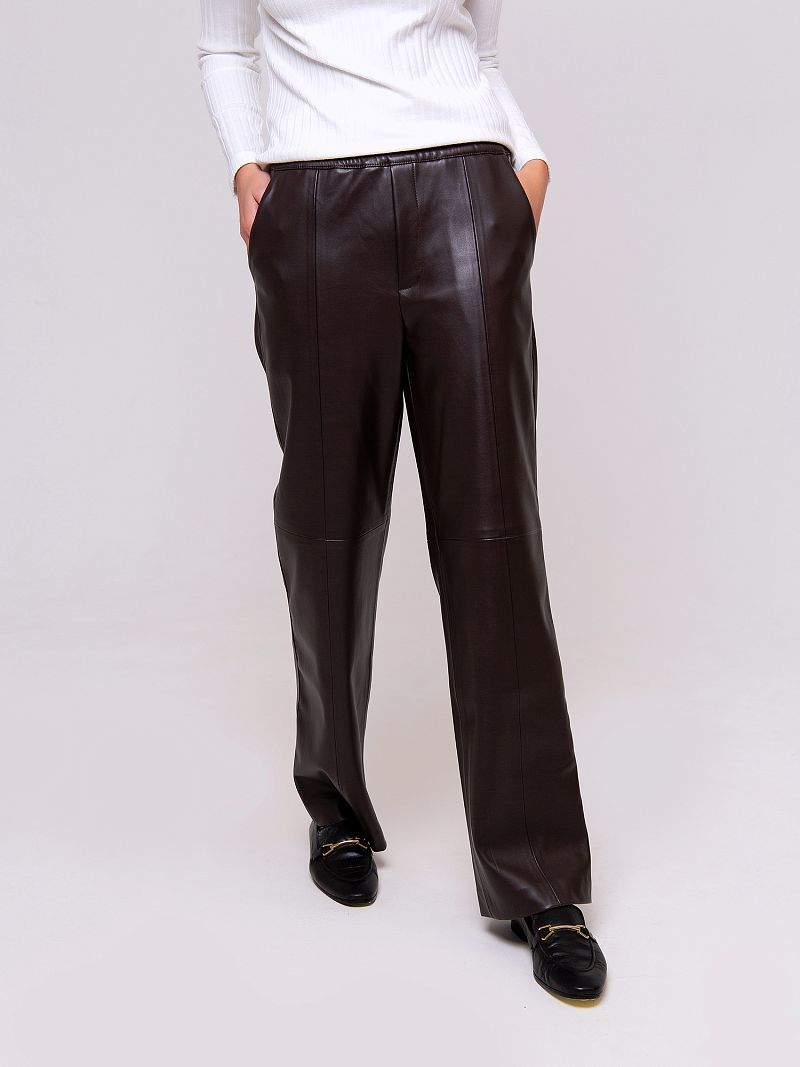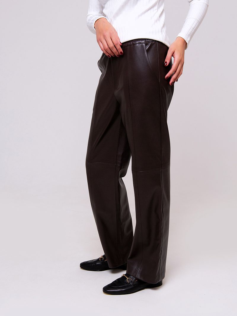 Брюки из мягкой экокожи с велюровой подкладкой. Кожа премиум качества. Брюки имеют высокую посадку, прямой силуэт. Переднее и заднее полотно брюк выполнено с декоративным швом. Длина изделия по боковому шву 102 см. Рост модели 173 см. Уход: допустима ручная стирка. При значительных загрязнениях требуется химчистка. Запрещено выкручивать изделие. Утюжка только на низких температурах через ХБ полотно.