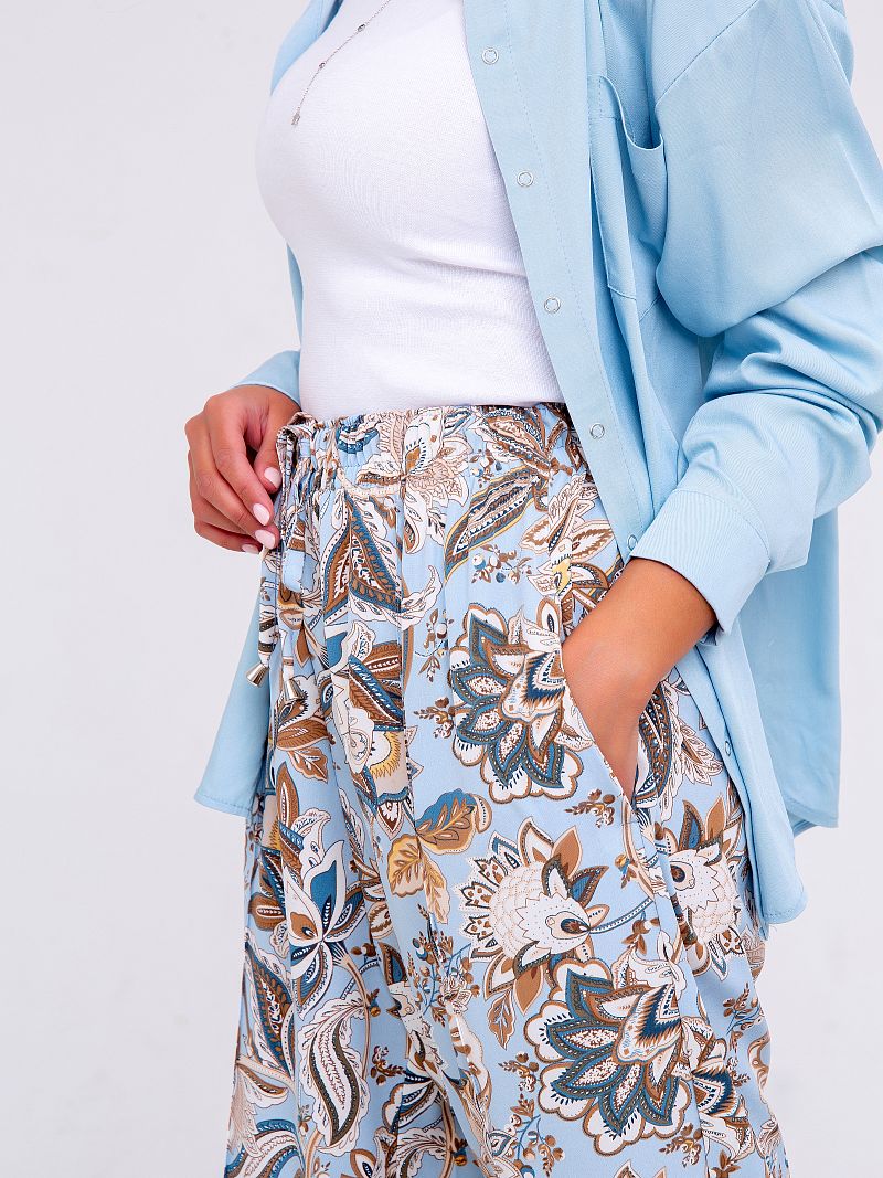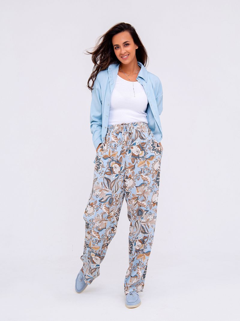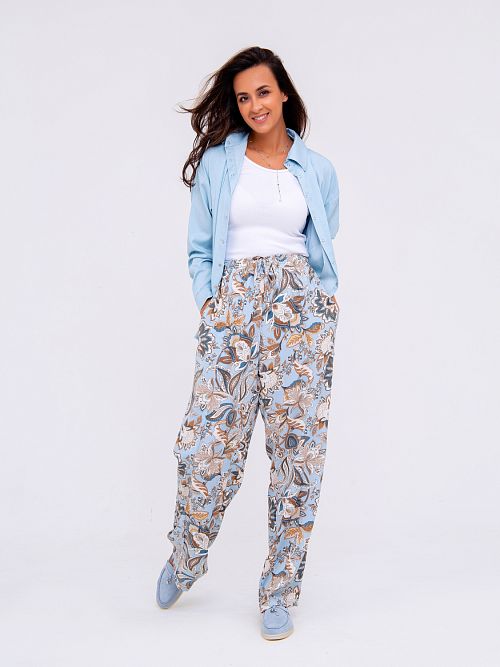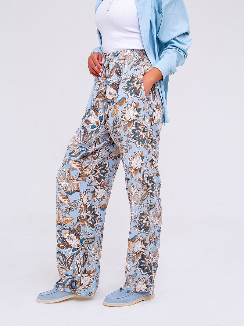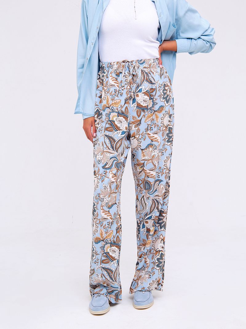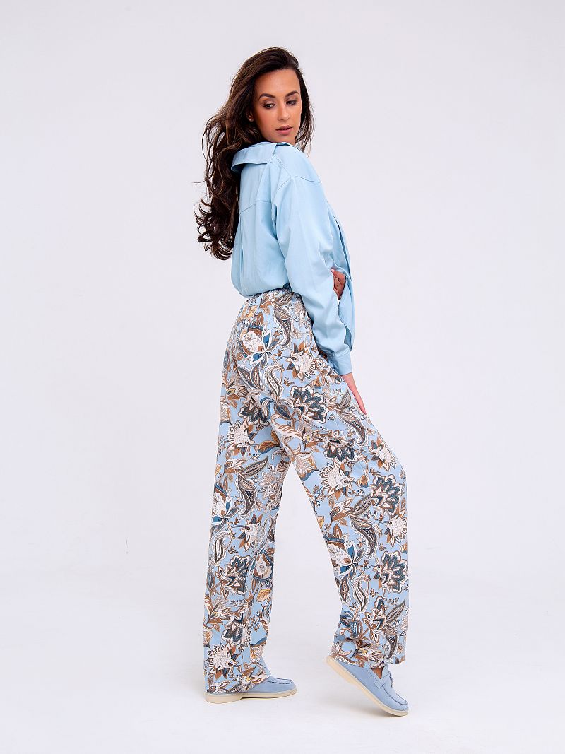 Новая весенняя коллекция от Рапоза отличается воздушными образами и пастельными тонами. Абсолютная нежность! Брюки прямого кроя с отстрочкой и боковыми карманами. Пастельные оттенки голубого в сочетании с принтом в стиле "пейсли" создают летящий и элегантный образ! Ограниченная коллекция только для этой весны!