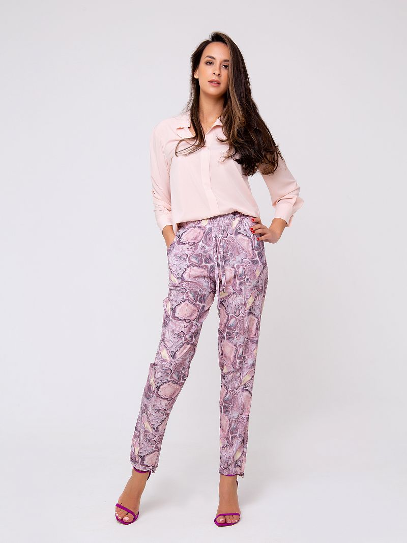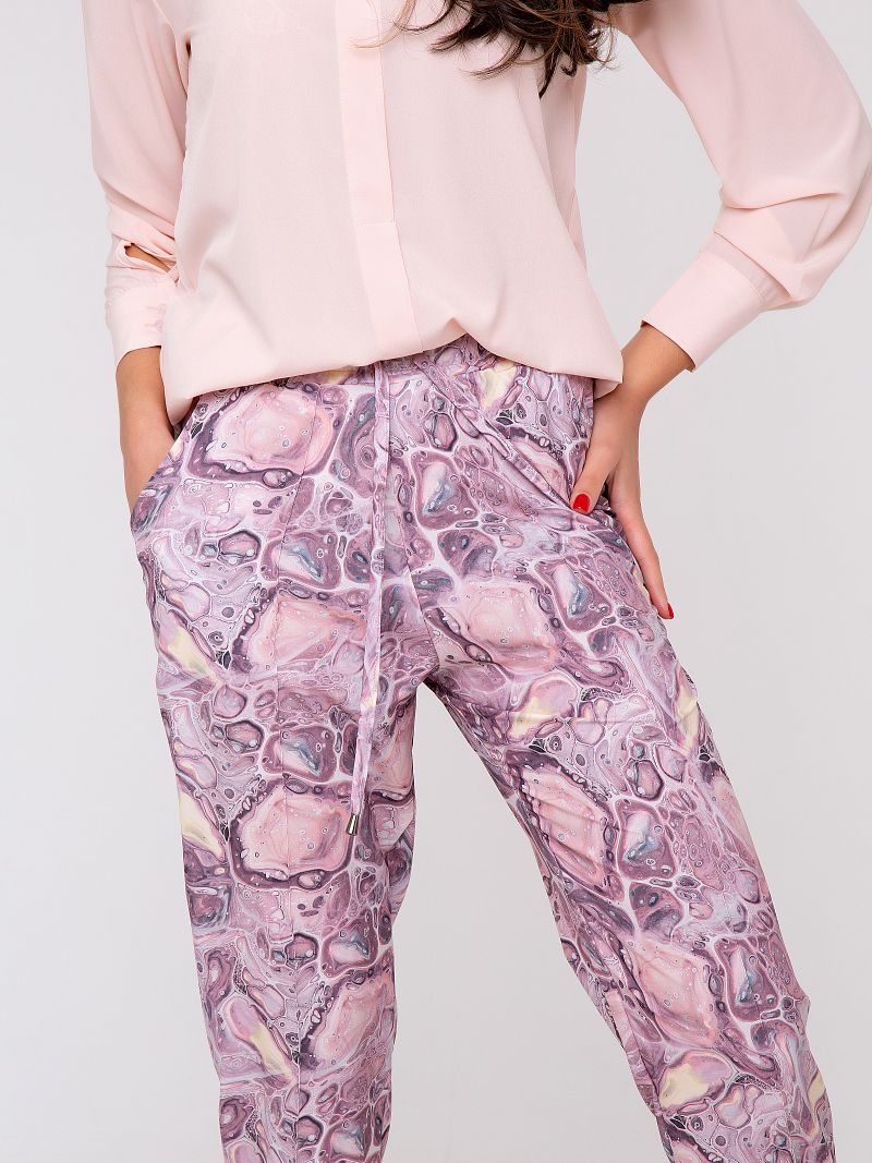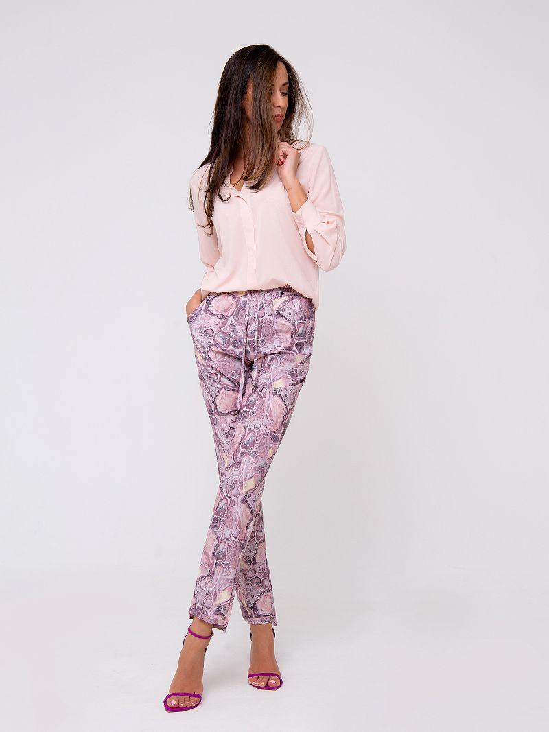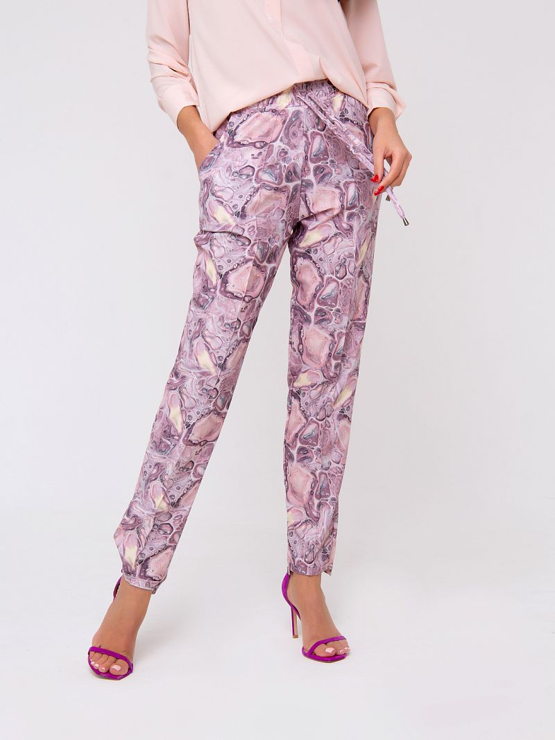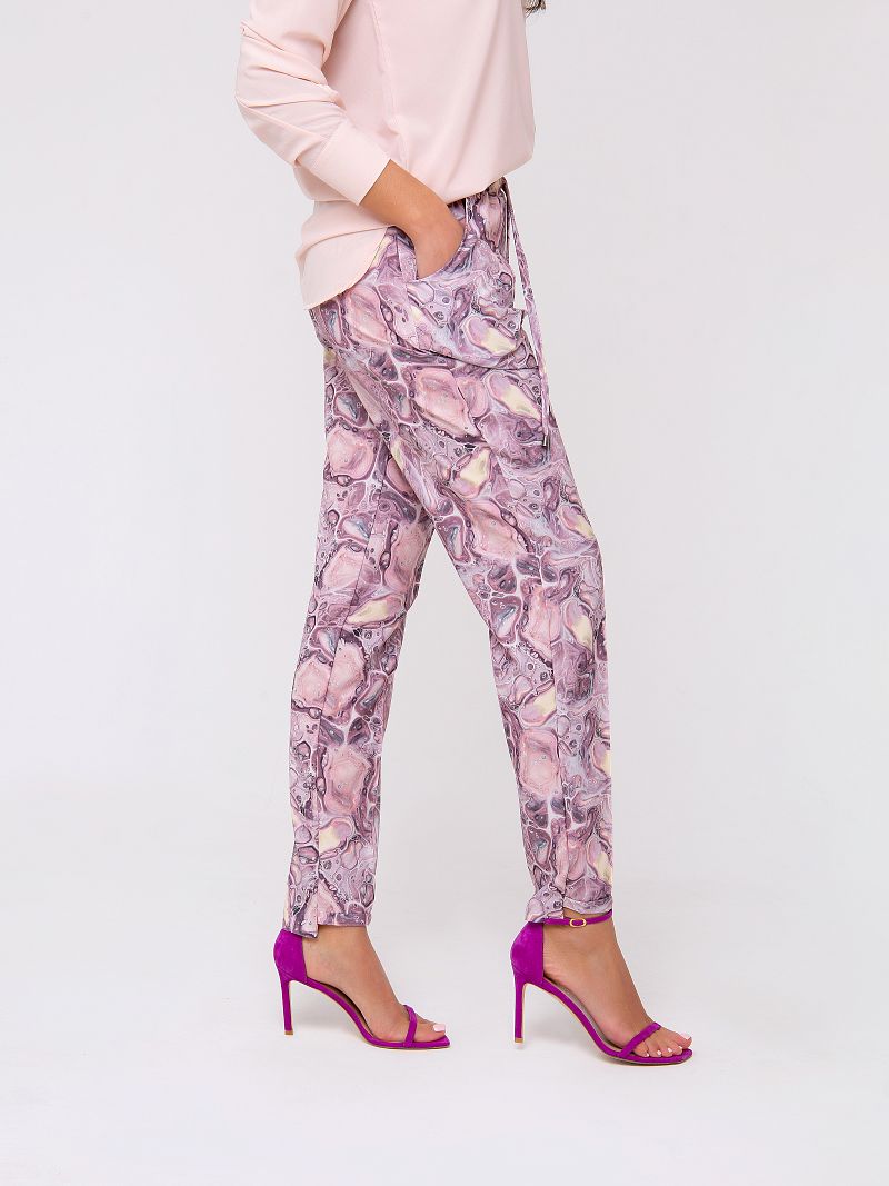 Новая весенняя коллекция от Рапоза отличается воздушными образами и пастельными тонами. Абсолютная нежность! Брюки прямого кроя с отстрочкой и боковыми карманами. Пастельные оттенки лилового в сочетании с принтом в стиле абстракция создают летящий и элегантный образ! Ограниченная коллекция только для этой весны!