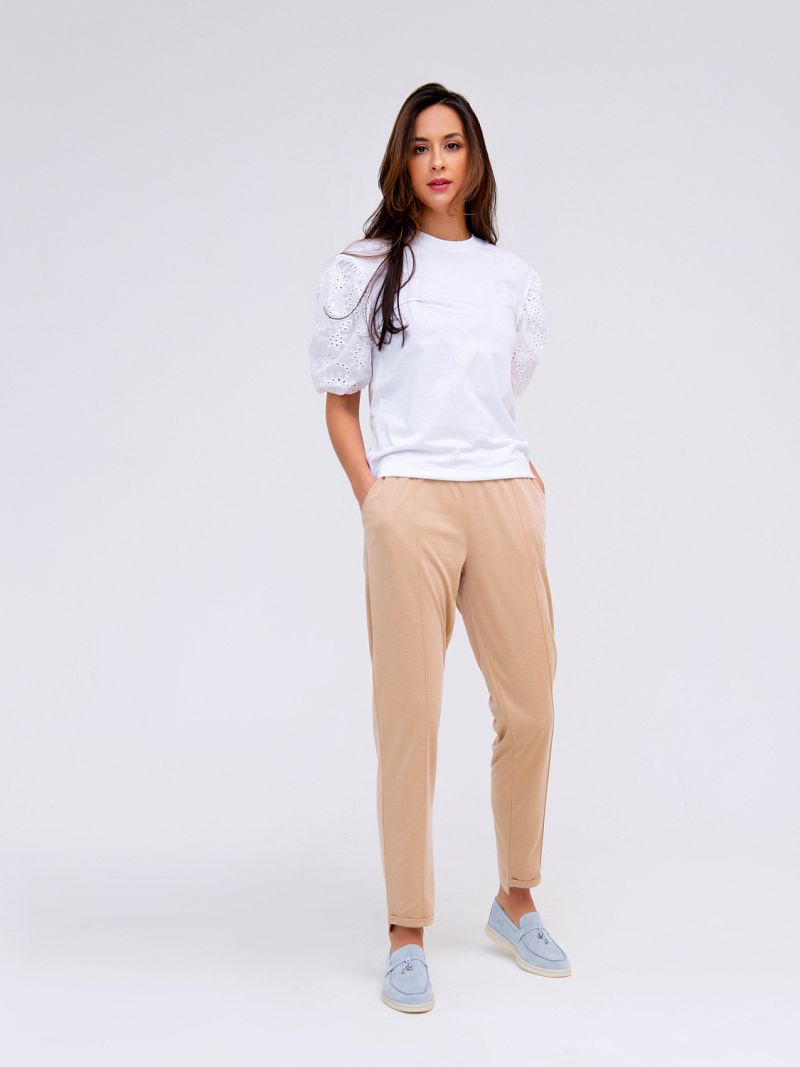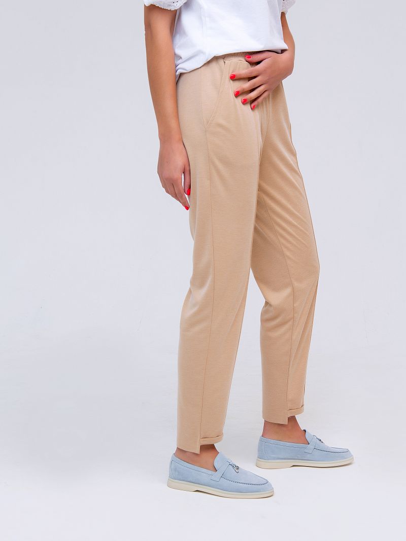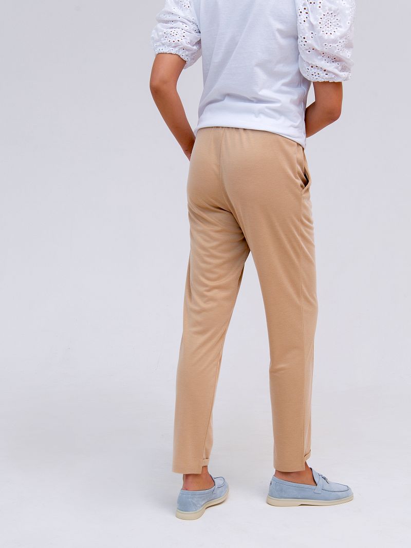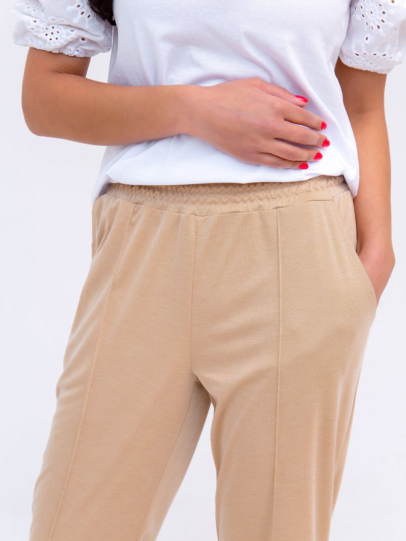 Женские брюки прямого кроя, на резинке. Трикотажное полотно, нейтральный тон, укороченная длина модели - бестселлер нашей коллекции! Модель лаконичного дизайна, брюки оформлены "стрелками". Прекрасный выбор для жаркого лета! Изделие дополнено боковыми карманами. Состав: 40% лён, 60% вискоза. Рост модели на фото 173 см.