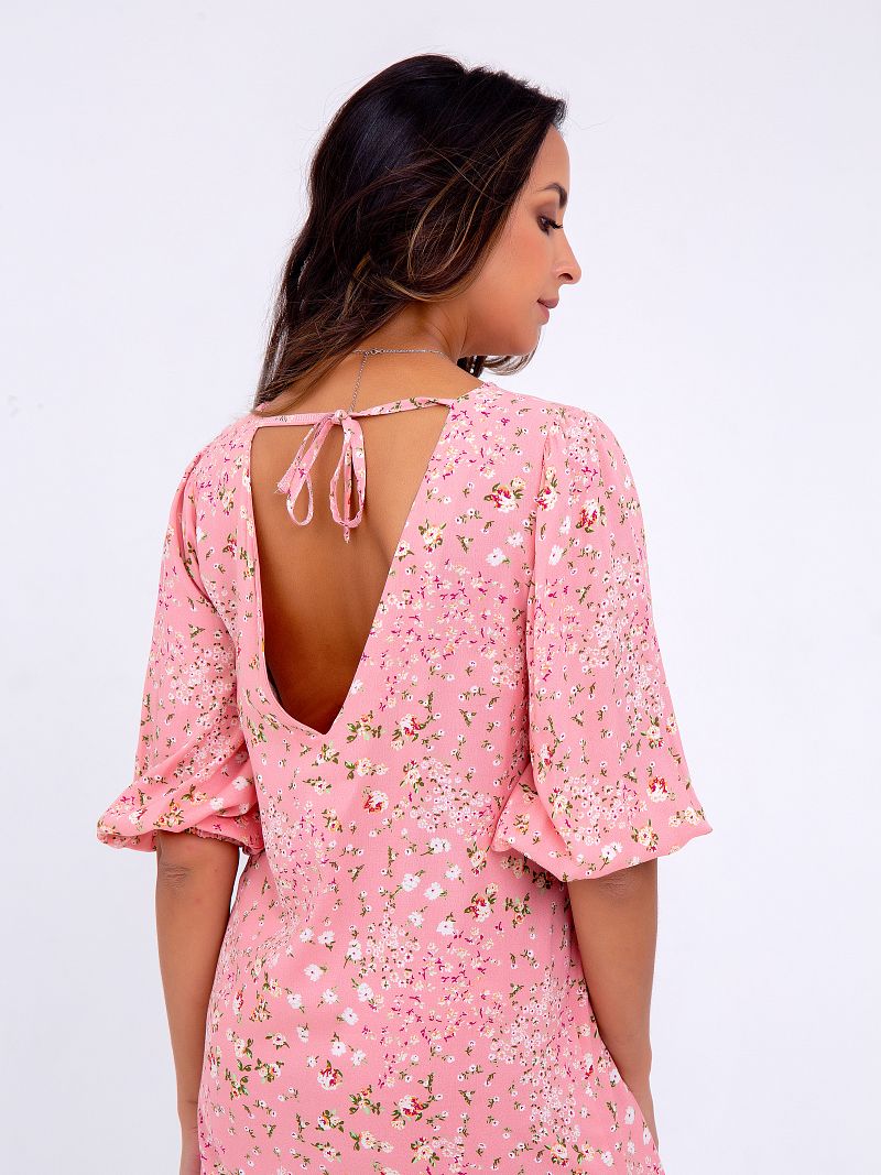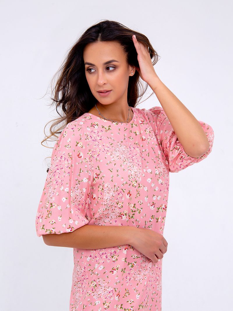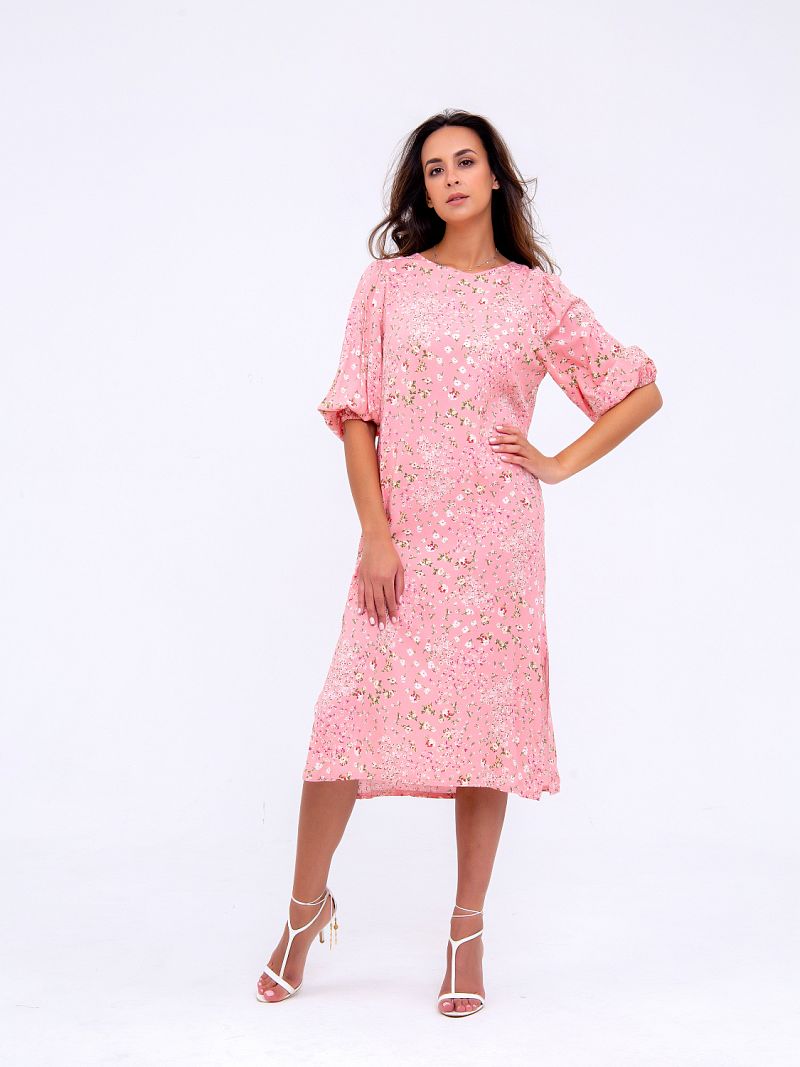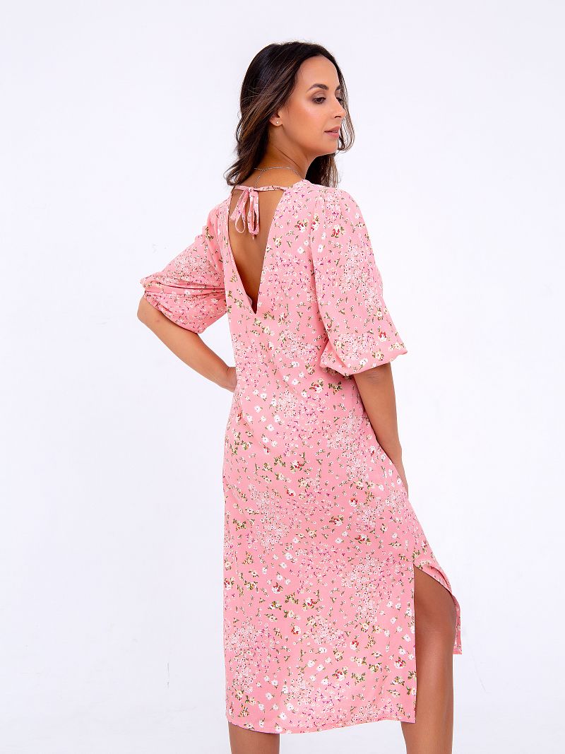 Нежное платье-миди, оформленное цветочным принтом по всей длине изделия. Модель свободного кроя с боковыми разрезами, что позволяет ткани струиться и придаёт образу лёгкости и воздушности. Рукав 3/4 на резинке. Вырез горловины округлый спереди и V-образный сзади на завязках. Ткань - штапель. Состав: 100% вискоза. Рост модели на фото 173 см (+каблук)