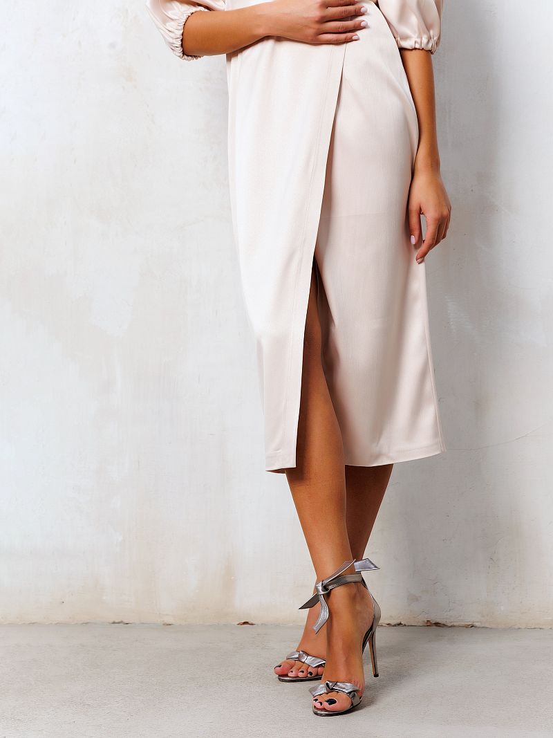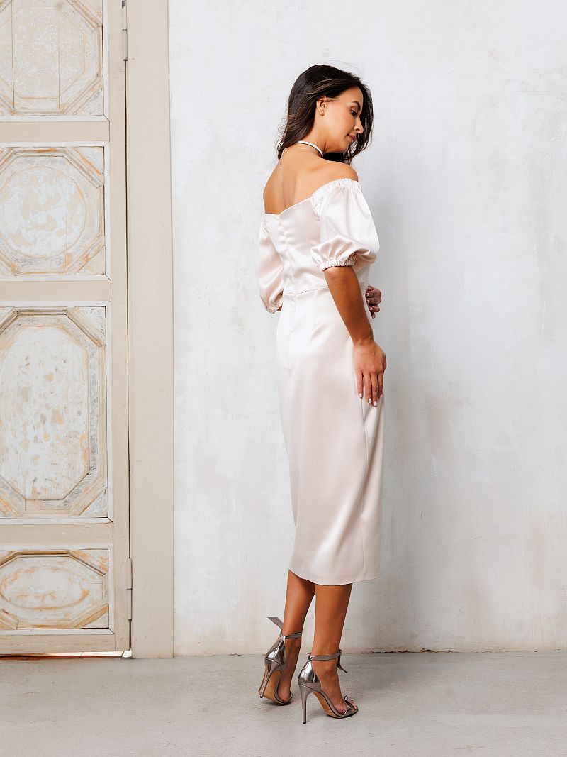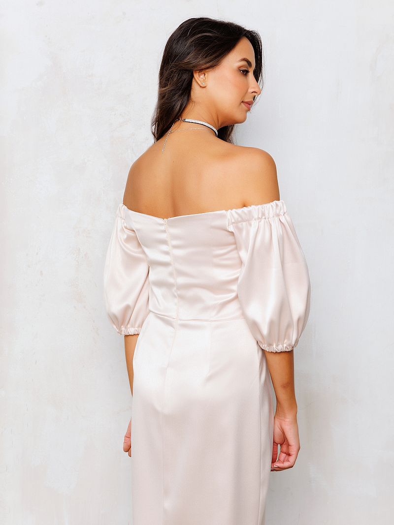 Вечернее платье из атласа - идеальный выбор для любого торжественного мероприятия. Платье выполнено из высококачественного материала, благородный молочно-бежевый оттенок подчеркнет вашу красоту. Открытые плечи и объемные рукава фонарики придают элегантный и изысканный вид, подол "тюльпан" не сковывает движения и делает образ еще женственней. Независимо от того, на какое мероприятие вы наденете, платье из премиум линейки Raposa обязательно привлечет внимание и оставит яркое впечатление.
