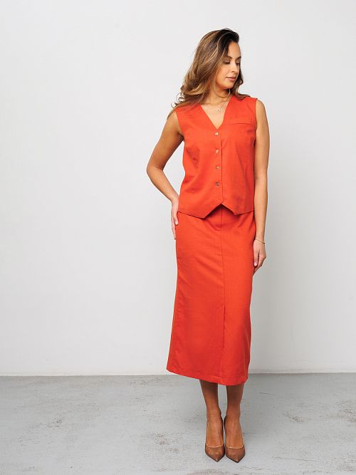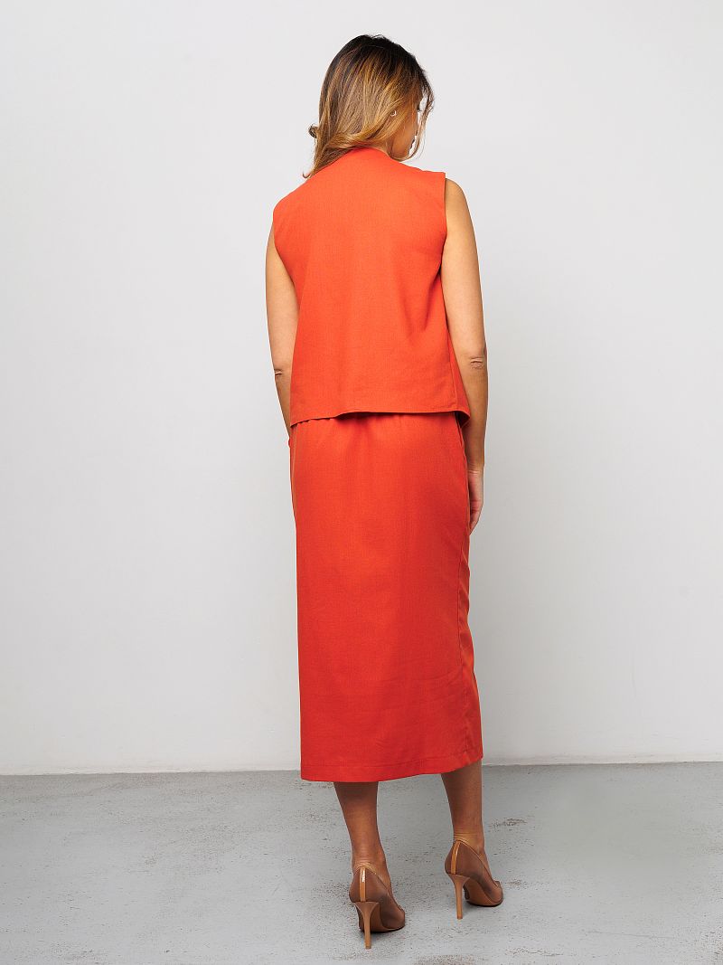 Костюм женский с юбкой и жилеткой от Raposa – стильное и комфортное решение для современных женщин 2025, ценящих элегантность и практичность. Это идеальное сочетание классики и тренда. Благородство однотонного дизайна дополняется удобством. Летний и весенний базовый костюм из дышащего и немнущегося льна станет лучшим выбором для вечерних мероприятий, деловых встреч или просто для отдыха на море. Красный костюм льняной с юбкой миди и однобортным жилетом поможет создать незабываемый нарядный образ в классическом стиле. Длинная юбка макси с разрезом спереди и прорезными карманами в боковом шве добавляют образу женственности и комфорта, а жилетка с застежкой на пуговицы придает ему особый шарм. Эргономичная резинка на поясе сзади мягко прилегает к талии без сдавливания и создает корректирующий эффект, способствуя идеальной посадке. Костюм двойка из льняного материала с добавлением вискозы обеспечивает комфорт в жаркую погоду, а его гладкая фактура приятно ощущается на коже. Модель костюма премиум качества в стиле олд мани прекрасно подойдет для женщин больших размеров плюс сайз до 54 и 56, подчеркивая достоинства фигуры и позволяя выглядеть шикарно и безупречно. Полуприлегающий силуэт этой модели удобен на весну, на лето для беременных. Костюм женский праздничный – идеальный вариант на выпускной или на свадьбу, для подружек невесты. Костюм лен прекрасно подходит для учебы в колледже или университете для девочки подростка, для прогулок или как офисный костюм юбка кофта. Строгий комплект двойка с безрукавкой с глубоким V – образным вырезом поможет создать актуальный образ красивой и уверенной в себе женщины.
